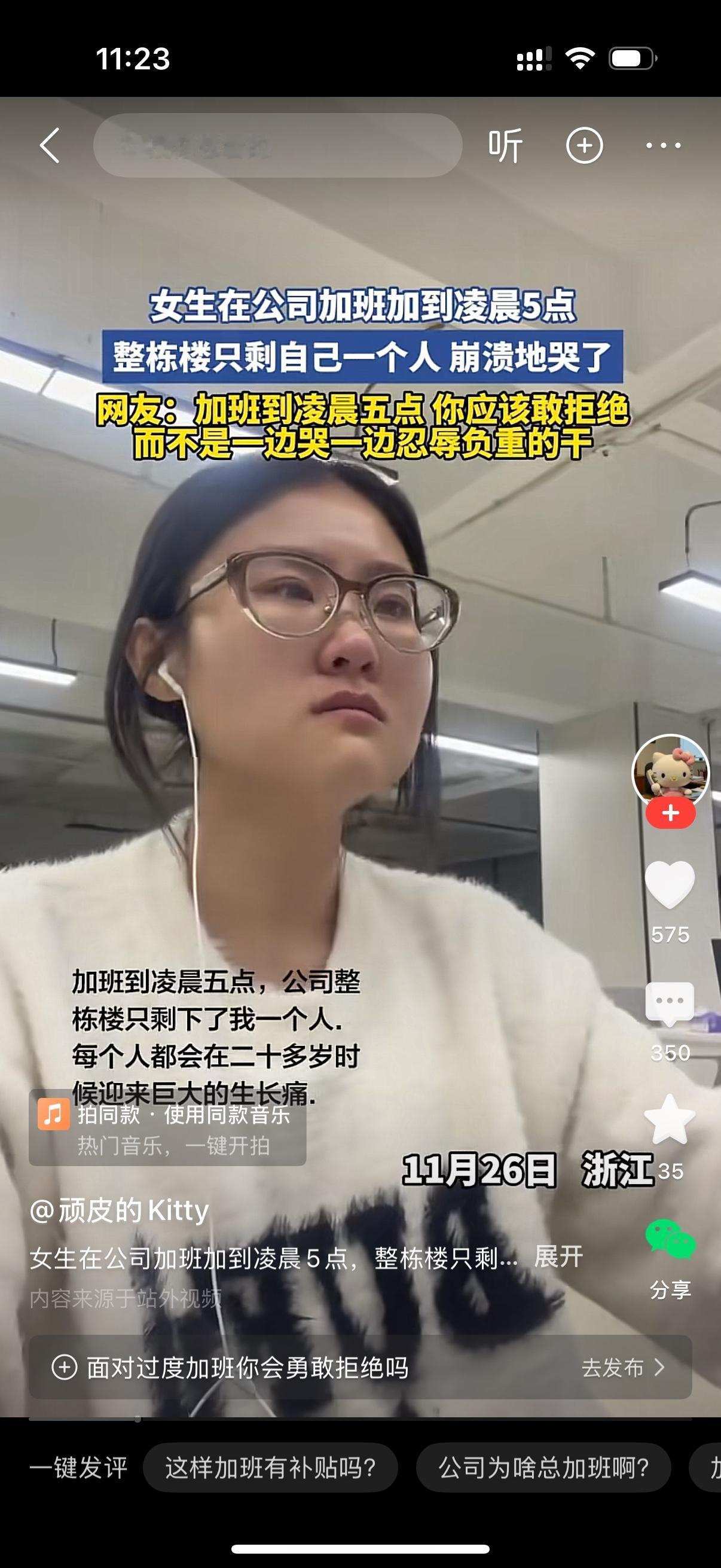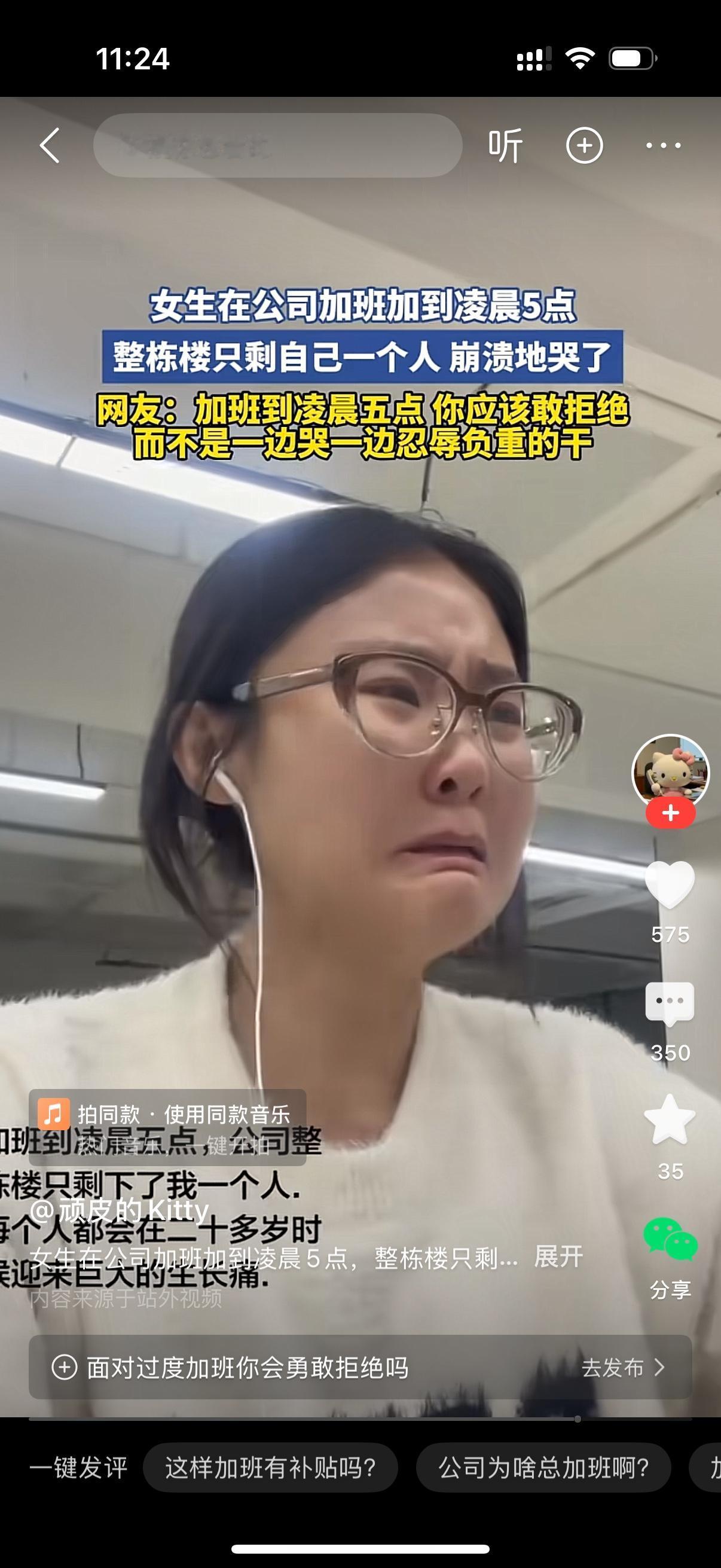 女生在公司加班到凌晨五点,整栋楼只剩自己一个人,她崩溃地哭了。她虽然哭了,但擦干眼泪继续忍辱负重地干。这好像是自己刚毕业那段时间的真实写照。那个时候根本不知道什么叫拒绝,领导让加班就加班,让通宵就通宵。作为80后,在北上广深的我们都是类似的经历。孩子别哭,苦过累过就是蜕变。