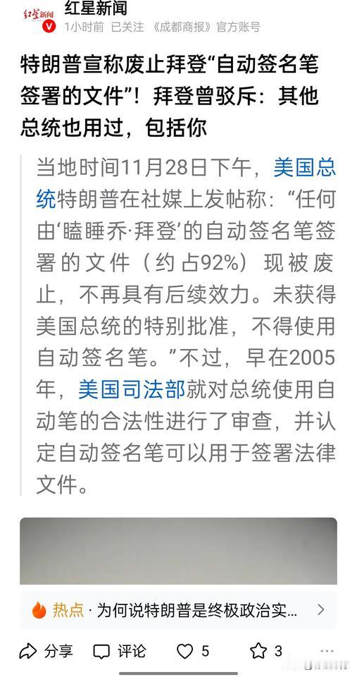 特朗普称:“任何由‘瞌睡乔·拜登’的自动签名笔签署的文件(约占92%)现被废止,不再具有后续效力。未获得美国总统的特别批准,不得使用自动签名笔。”问题是拜登使用自动签名笔签署文件的时候他就是“美国总统”啊,还要怎么证明是他批准的?而且特朗普自己也用过自动签名笔,他的理由是“那些都是不重要的文件”,摆明了就是“对手支持的我就反对”。[笑哭] 了解北宋历史的应该对这个场景比较熟悉,宋神宗去世后司马光终于等来了主持政府的机会,于是把此前所施行的新法尽行废除。从此开始新党上台行新法,旧党上台行旧法,北宋末年就在不停翻烧饼式的党争中迎来了“靖康之祸”。 美国会重蹈北宋的覆辙么?