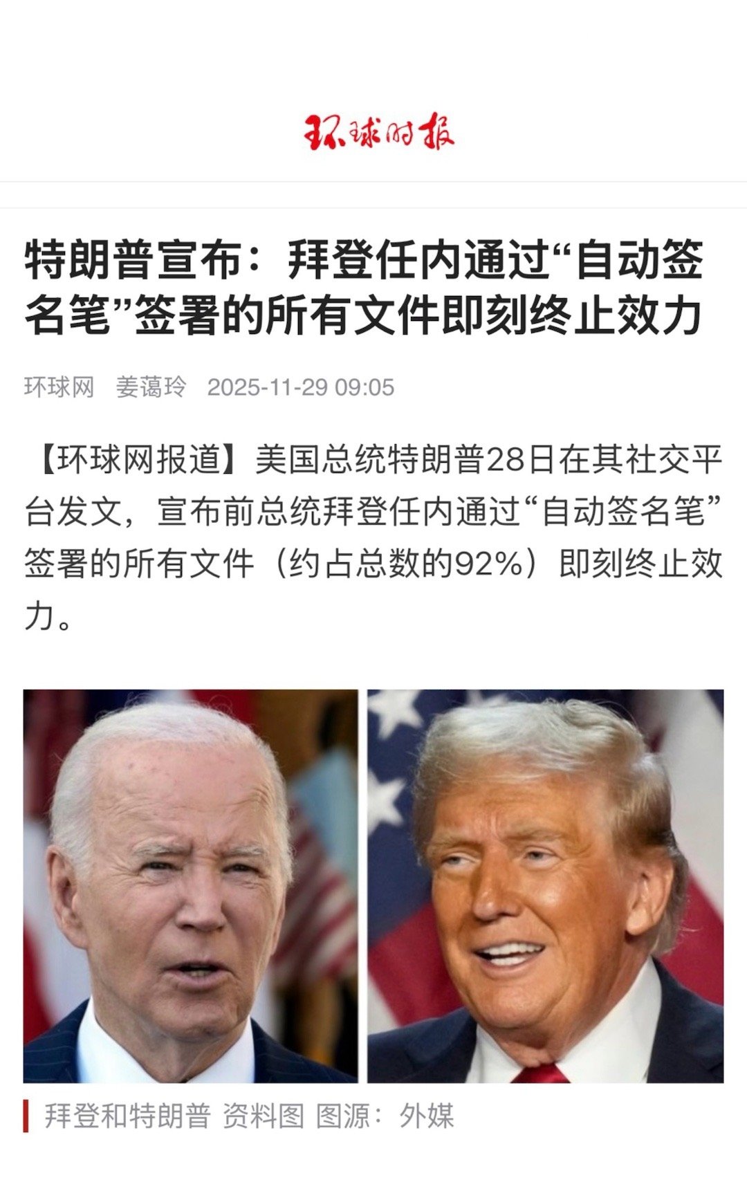 【特朗普宣布:拜登任内通过“自动签名笔”签署的所有文件即刻终止效力】 (环球网 2025-11-29 09:05 ) 美国总统特朗普28日在其社交平台发文,宣布前总统拜登任内通过“自动签名笔”签署的所有文件(约占总数的92%)即刻终止效力。 “未经美国总统特别批准,不得使用‘自动签名笔’。” 特朗普在帖文中补充说。 特朗普还称,所有行政命令,以及任何不是由拜登直接签署的文件,全部作废,理由是操控“自动签名笔”的人员属“违法行事”,而拜登本人“并未参与”自动签名相关流程。他还称,如果拜登称其参与过,“他将面临伪证罪指控”。 长期以来,“自动签名笔”一直是特朗普及其支持者指责拜登的争议点之一。据《美国新闻与世界报道》报道,特朗普声称,拜登政府的官员可能利用“自动签名笔”伪造总统签名,并执行了一些拜登本人并不知情的重大行动,甚至包括签署赦免令这类重要决策。但据《纽约时报》此前援引拜登对特朗普指控的回应称,他确实在任内使用过自动签名笔签署赦免令,但每个决定都由他本人作出。拜登批评特朗普是“骗子”,称共和党人挑起自动签名笔争议是为了“转移公众注意力”。 网页链接