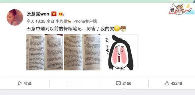 这就是演员文化程度对角色的分晰影响到她的认知和表演。也是张慧雯每一个角色都让人看了印象深刻,总想一刷再刷她的剧的原因。 除了看张慧雯的选的角色和体现的演技,觉得她有文化修养,看张慧雯笔记本书写的工整性和详细度,更可见到她对学习工作的认真和钻研态度。 也因此可以理解她为何会把、能把一部影视的角色编排成一个舞蹈戏剧,一堆舞蹈出身的前辈同行看了纷纷点赞。 还有采访时的言之有物,这都是她有注重文化修养的体现。不管我每天写张慧雯有没有人点赞,粉她这样素质高性格可爱人品正的女演员,有范!