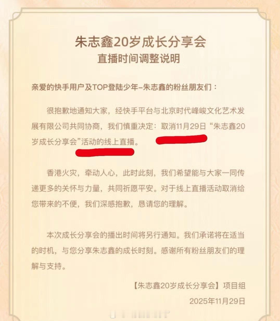 朱志鑫20岁成长分享会的线上直播宣布取消了。