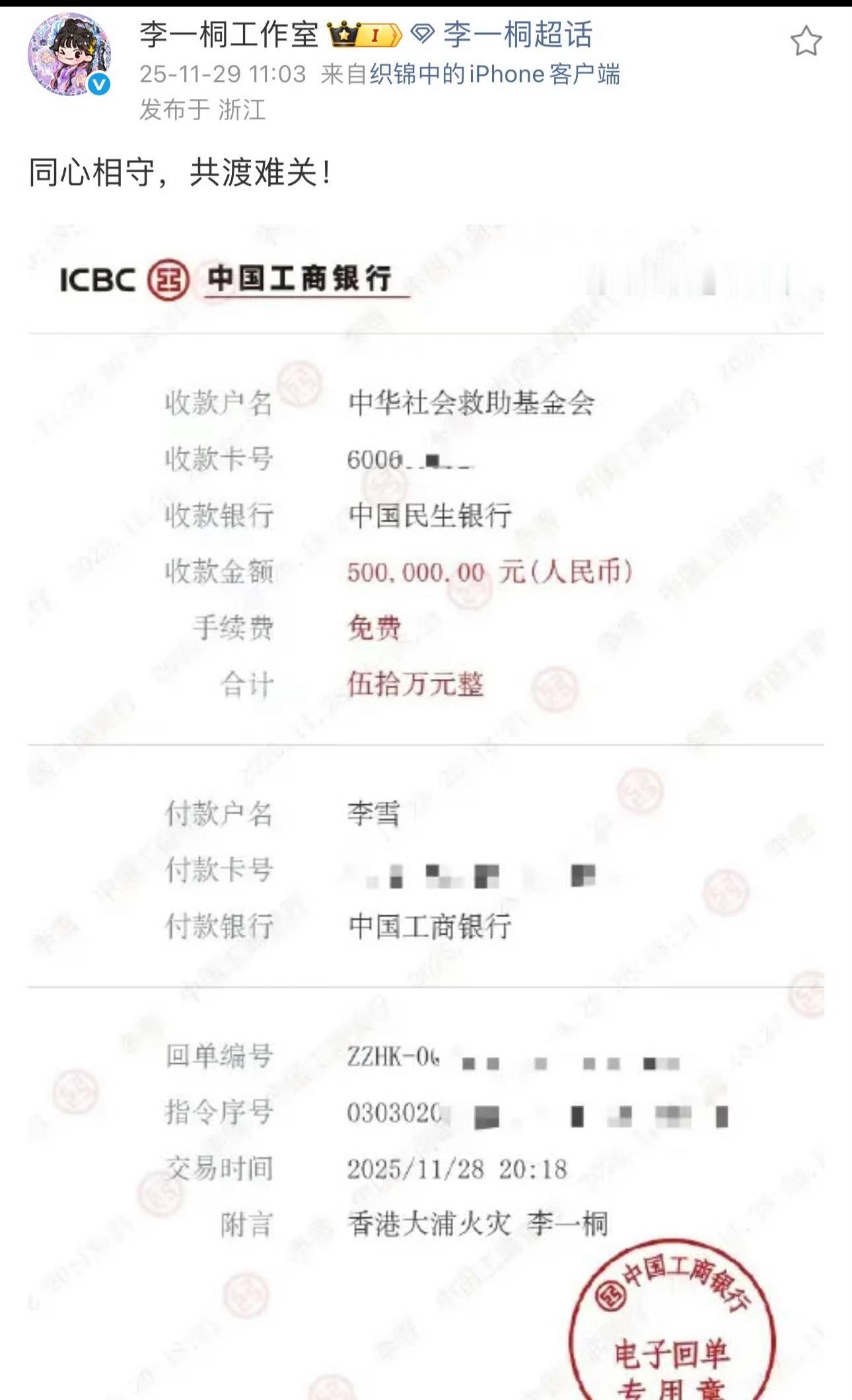 李一桐捐款50万元人民币支援香港大埔火灾救援