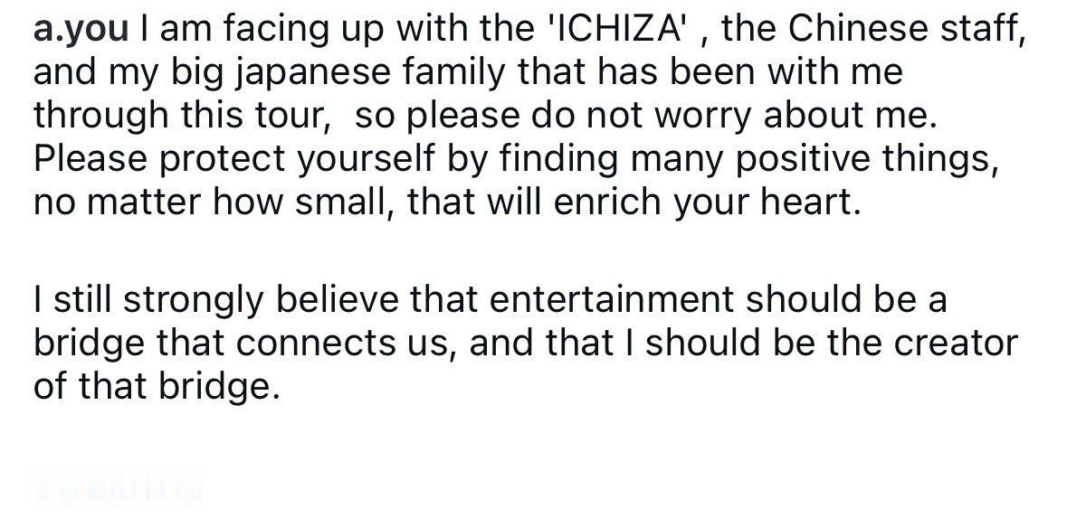 滨崎步穿着印有“上海”字样的衣服,以及和工作人员的合影,发布了对歌迷们的安慰文字:我现在正和"ICHIZA"的中国工作人员,以及这次巡演中一直陪伴我的日本大家庭在一起,所以请不必担心我。请你们也要保护好自己,去发现生活中许许多多哪怕是微不足道的积极事物,这让内心丰盈充实。我依然坚信,娱乐应当成为连接你我的桥梁,而我愿成为这座桥梁的筑造者。