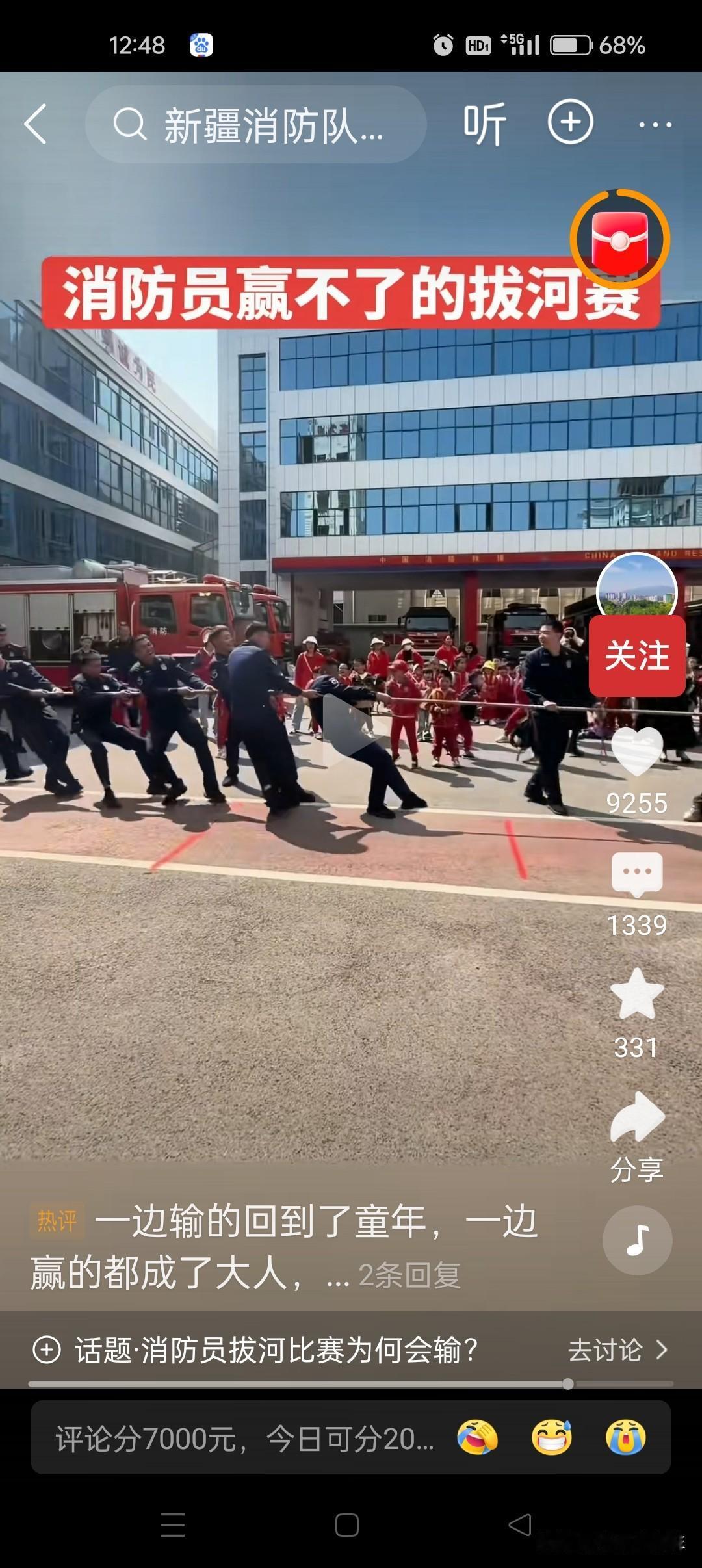 消防队员与小朋友拔河友谊比赛,消防队员成了香饽饽,几乎每个班级都要求与消防员比赛,因为消防队员是菜鸟,连一年级的都拔不过,小朋友赢了高兴的不得了,还说消防队员叔叔该训练训练了。 结果是皆大欢喜,小朋友欢喜,消防员们开心。