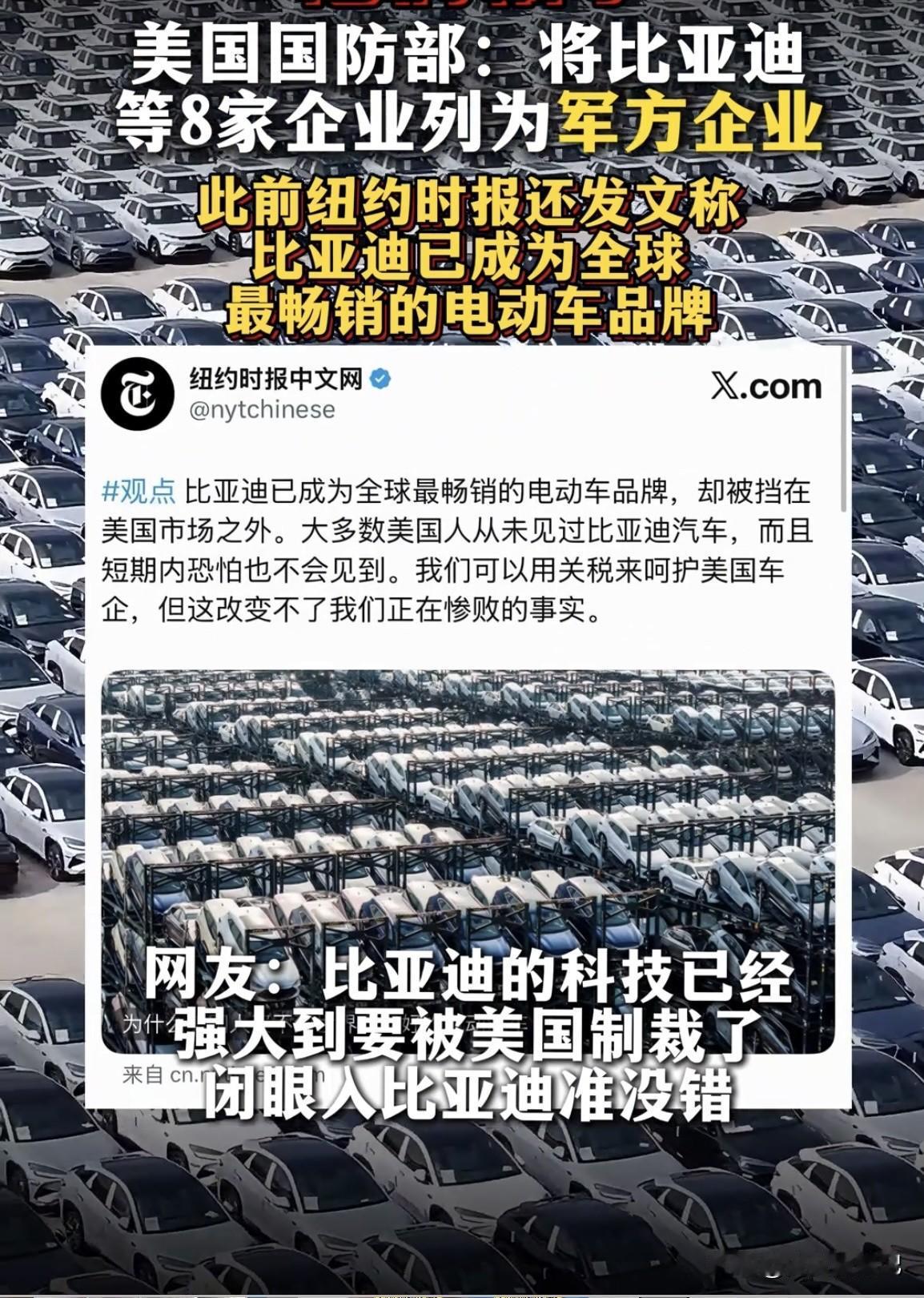 美国国防部又搞小动作,把比亚迪等8家中国企业列为军方企业。这“中国涉军企业名单”就是美国搞的幺蛾子,从2020年就开始作妖,目的是防止中国军事现代化。 先不说这毫无根据的指控有多荒谬,纽约时报还曾评价比亚迪为最畅销的电动车品牌。比亚迪在电动车领域那可是风生水起,技术实力杠杠的。被列入名单虽不涉及立即禁令,但想损害企业声誉。不过,此前腾讯等中企就回应这是错误,还打算复议甚至诉讼。比亚迪肯定也不会坐以待毙,美国这无理打压注定是白费力气。