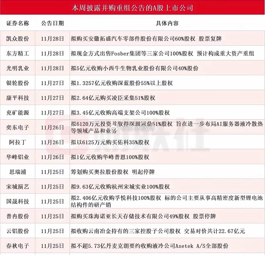 A股并购重组潮引爆涨停奇观!15天10板王者之后,谁将接棒?临近年末,A股并购重组市场持续活跃。据财联社不完全统计,本周共有16家A股公司披露并购重组进展,引发市场高度关注。并购效应在二级市场立竿见影!·国晟科技因收购孚悦科技100%股权,走出15天10板行情;·金富科技计划收购广东蓝原科技股权,斩获5连板。这两家公司的表现,彰显市场对优质资产并购的认可。本周并购市场呈现多点开花态势,涉及新能源、半导体、汽车零部件等多个重点领域。凯众股份、东方精工、光明乳业、银轮股份等多家知名企业均披露最新进展。上市公司正通过外延式扩张寻求新的业绩增长点,为年末市场注入活力。在明星股耀眼表现后,市场目光将投向下一个潜力标的。三大领域值得重点关注:·半导体行业:思瑞浦拟收购奥拉半导体,后者拥有国际化技术团队,在六大研发中心布局,研发人员占比超70%。·新能源汽车链:凯众股份收购安徽拓盛60%股权,标的公司专注于汽车橡胶基弹性体减震、密封元件,已进入比亚迪、吉利、理想等主流车企供应链。业绩稳健,2023年净利润4171万元,2024年增至5902万元,与主业协同效应显著。·存储半导体:普冉股份收购诺亚长天,后者持有专注高性能存储器的SHM公司,具备成熟销售网络和稳定客户。业内分析认为,政策环境优化与合理估值区间为并购重组提供有利条件。随着产业资本加速布局,那些通过并购切入优质赛道、形成协同效应的公司,有望获得资金青睐。谁将成为下一个“国晟科技”?答案或许就藏在这些正在推进的并购案中。