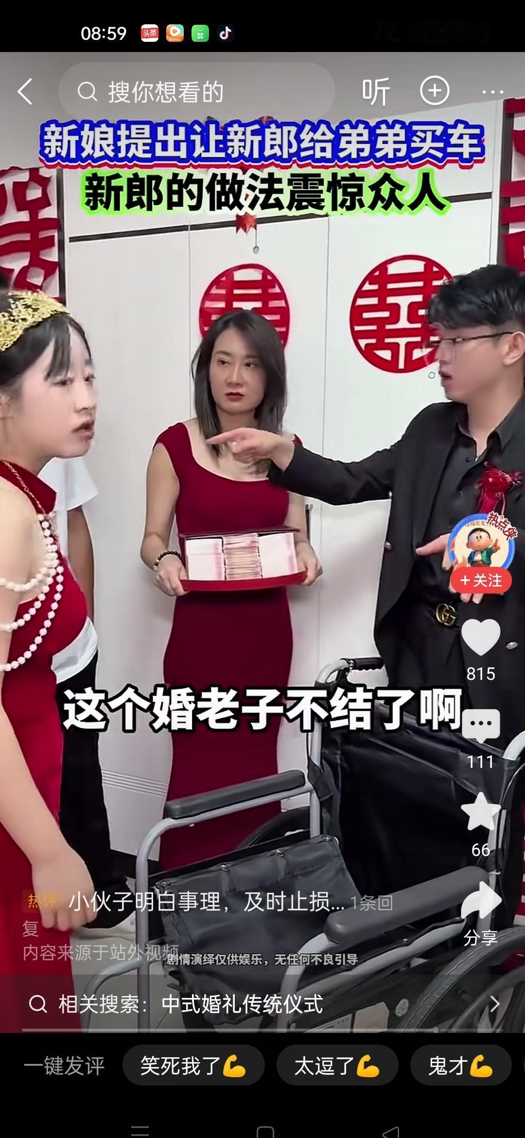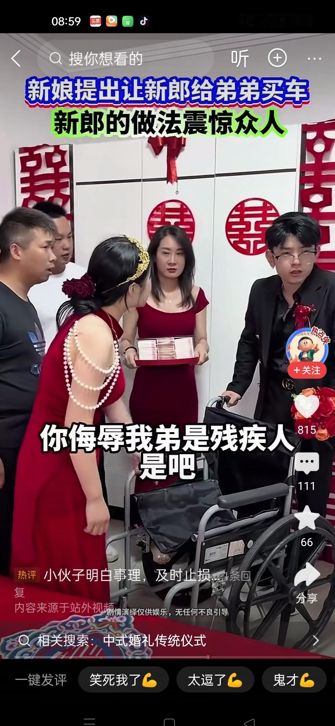 新婚接亲闹要车, 彩礼当场退, 婚约说散就散。 新娘弟弟跟新郎说要买50万新车,新郎问是两轮还是四轮。 弟弟说是四轮的,新郎直接推了台轮椅过去,说是早就给准备好了。 新娘这才发现被耍了,质问新郎是不是在侮辱弟弟。 新郎发火说弟弟手脚齐全要买车算什么残疾,全家都是吸血鬼,当场宣布不结婚了还要回彩礼。 闹脾气谁都见过,但真有人敢在结婚当天这么干。 新郎把彩礼袋一封封收回,新娘愣在那不知道该怎么办。 亲戚们围一圈谁也不说话,气氛冷得像霜打了的菜叶子。 这事儿传开后网上议论纷纷,但也没啥特别结论。 只能说谁都有原则,碰上不对的事儿,转身比硬撑更干脆。