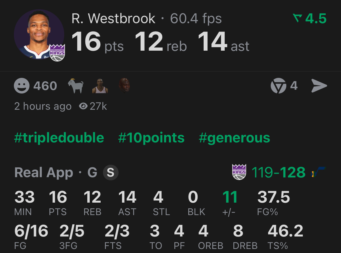 我龟又一个三双,正负值+11,然后国王输给了爵士9分…NBA