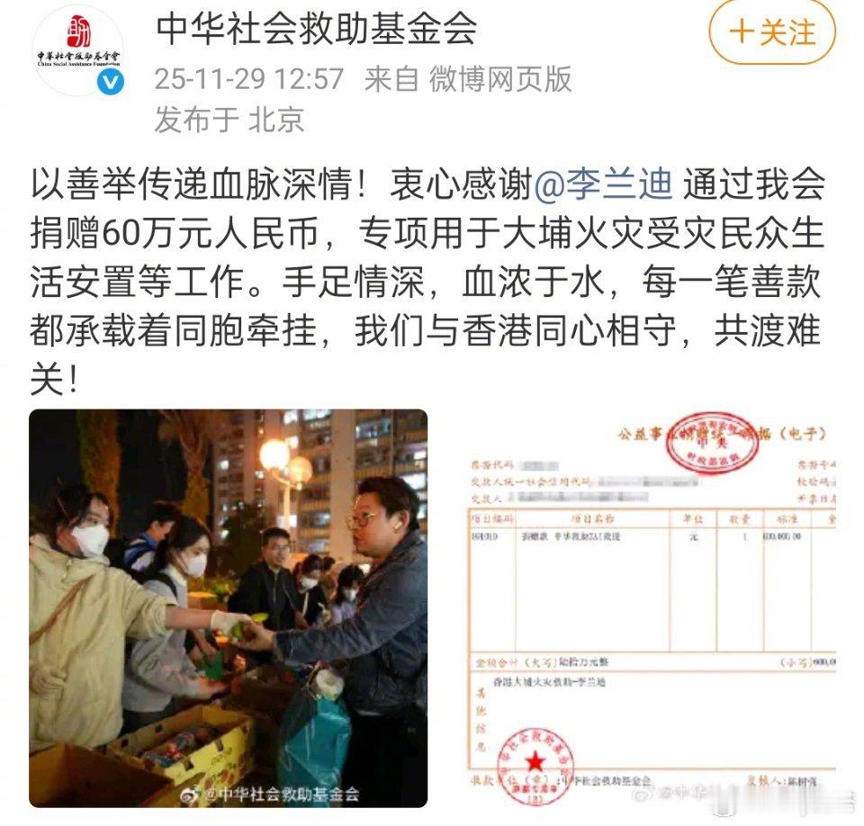 李兰迪捐善款60万李兰迪向香港捐款60万元李兰迪捐赠60万元支援香港!善举点亮希望!爱心凝聚的善款,将化为温暖的援手,为需要帮助的人们送去力量与关怀。为她的社会责任感与真诚善意点赞李兰迪