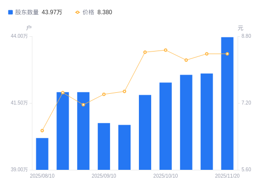 日期A股户数(户)流通A股户均持股数(股)户均持股市值(万元)2025-11-2043969211566.559.692025-11-1042607711936.1610.002025-10-2042557911946.989.832025-10-1042269312028.5510.192025-09-3041805012162.1510.242025-09-2040682612497.699.352025-09-1040750412476.909.252025-09-0241910512131.538.692025-08-3141910512131.539.042025-08-1040189112651.168.27
