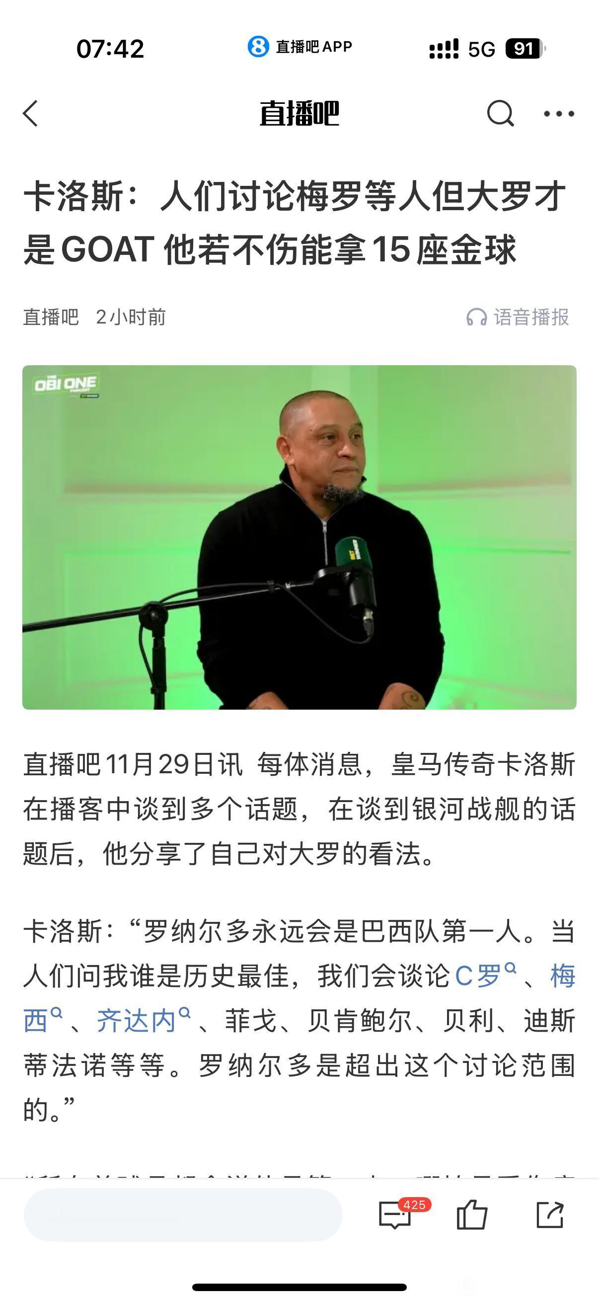 卡洛斯说大罗能拿15次金球奖,这个太夸张了。 足坛都喜欢夸自己时代的球员,卡洛斯当然力挺大罗是足球第一人,但并不是呀。 大罗联赛冠军没拿几个,欧冠都没有。 世界杯算一冠一亚非常好,跟姆巴佩差不多,进球数没有姆巴佩多,更比不上梅罗![大金牙]