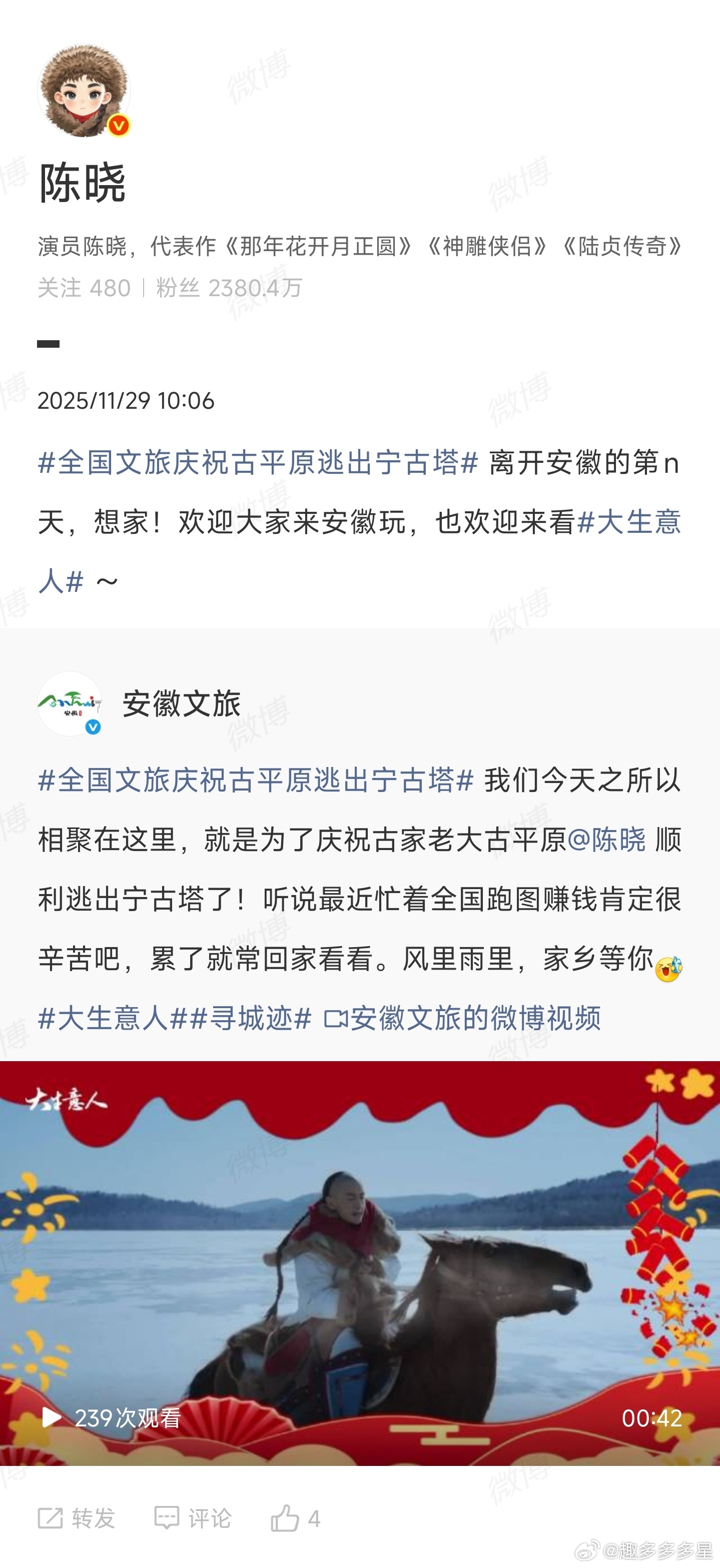 全国文旅庆祝古平原逃出宁古塔文旅君们卷起来比狗仔队还会追热点!刚把陈晓从宁古塔捞出,安徽秒变妈粉喊儿子回家吃早饭