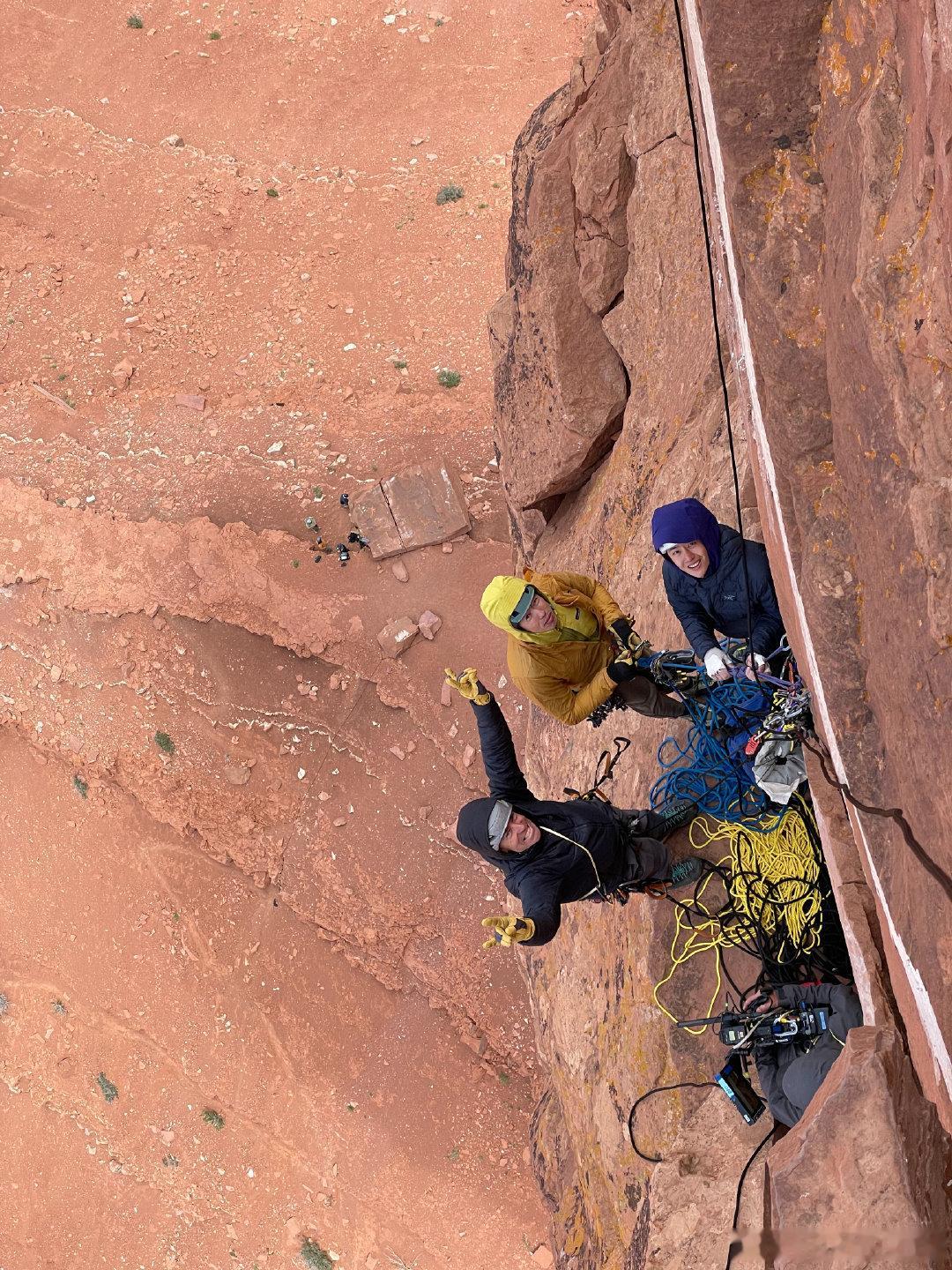 王一博岩壁上自拍王一博探索新境2幕后视角在垂直岩壁上自拍,笑得大白牙都露出来了