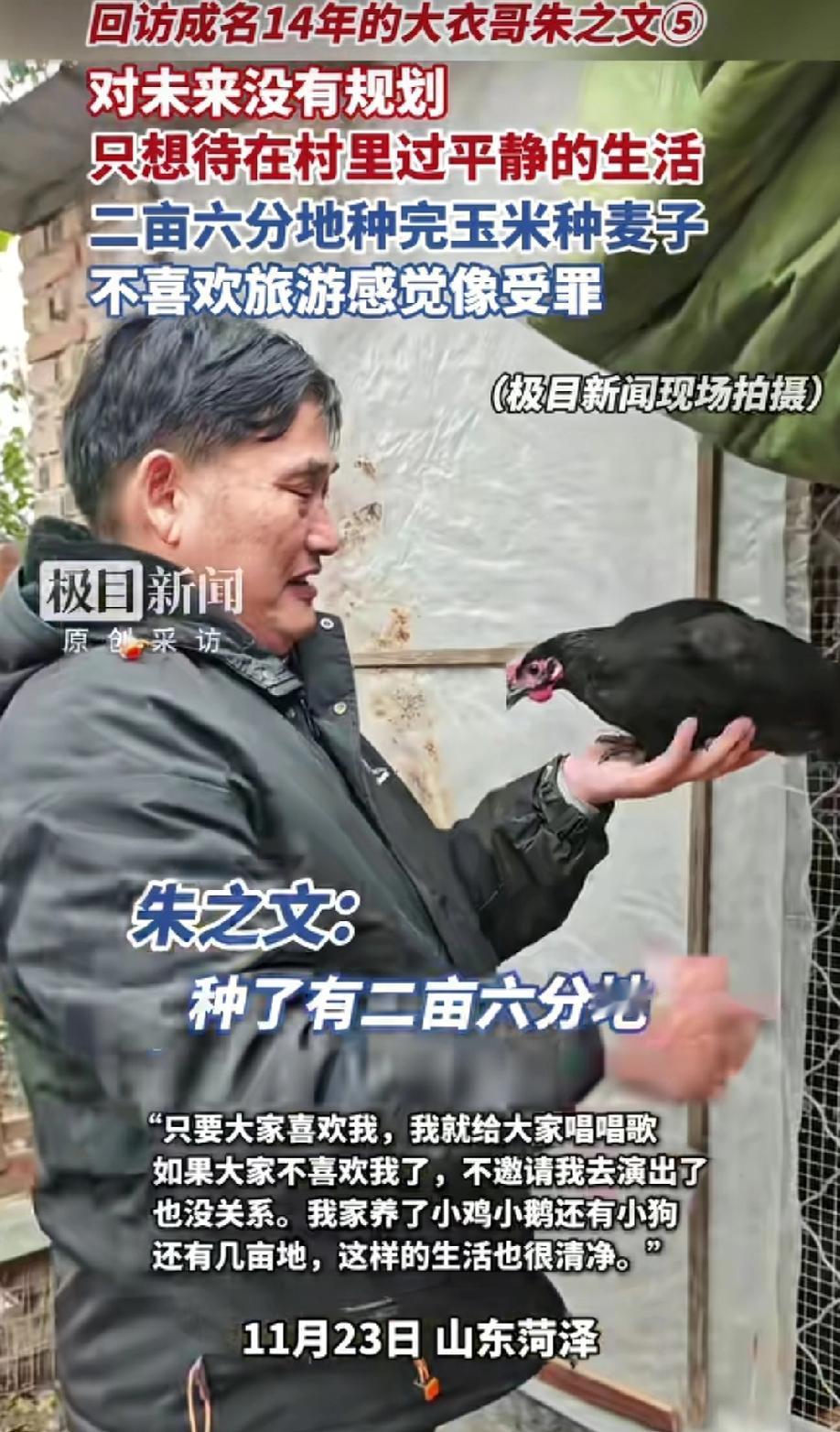 成名14年的大衣哥:守着二亩地养鸡鸭,不旅游不受罪,这日子到底值不值? 要说大衣哥朱之文,成名都14年了,按理来说早该在大城市住豪宅、到处逛景点享清福了吧? 可人家偏不,就乐意待在山东菏泽的村里,守着那二亩六分地,种完玉米种麦子,日子过得比咱普通人还接地气。 前阵子有人拍到他在自家麦地里慢悠悠溜达,记者问他对未来有啥打算,他笑呵呵说“没有规划”。 想干活了就去地里捯饬庄稼,不想干了就回家听个书、看个电视,再跟村里人赶个集、晒晒太阳聊聊天,小日子过得十分清净。家里还养着小鸡小鸭小狗,他没事就蹲在鸡窝旁逗逗鸡。 有人问他喜欢旅游吗,他一个劲摇头说:“不喜欢,出去就感觉是受罪”。你看那些当红艺人,不是在赶通告就是在旅游打卡发朋友圈,可大衣哥就爱守着家乡的一亩三分地。 之前有演出商掏大价钱请他去外地演出,他也实在的说:“大家喜欢我,我就唱;不喜欢了,不请我也没关系,家里鸡鸭和地够我忙活了”。 咱再瞅瞅娱乐圈里的那些事,多少明星为了名气拼命接活,最后把自己累得晕头转向。 可大衣哥呢,成名后没飘,还守着农民的本分。有人说他没追求,可他这日子过得舒服自在啊。每天看着庄稼从种到收,鸡鸭慢慢长大,这种踏实劲是多少人羡慕不来的。 现在好多人总觉得赚大钱、住好房才叫成功,可大衣哥用14年证明,守着自己喜欢的生活,哪怕只是种玉米麦子、喂鸡逗狗,也能过得有滋有味。你说,这日子到底值不值?咱普通人是不是也该想想,到底是追着名利跑舒坦,还是守着自己的小日子心里踏实? 大衣哥