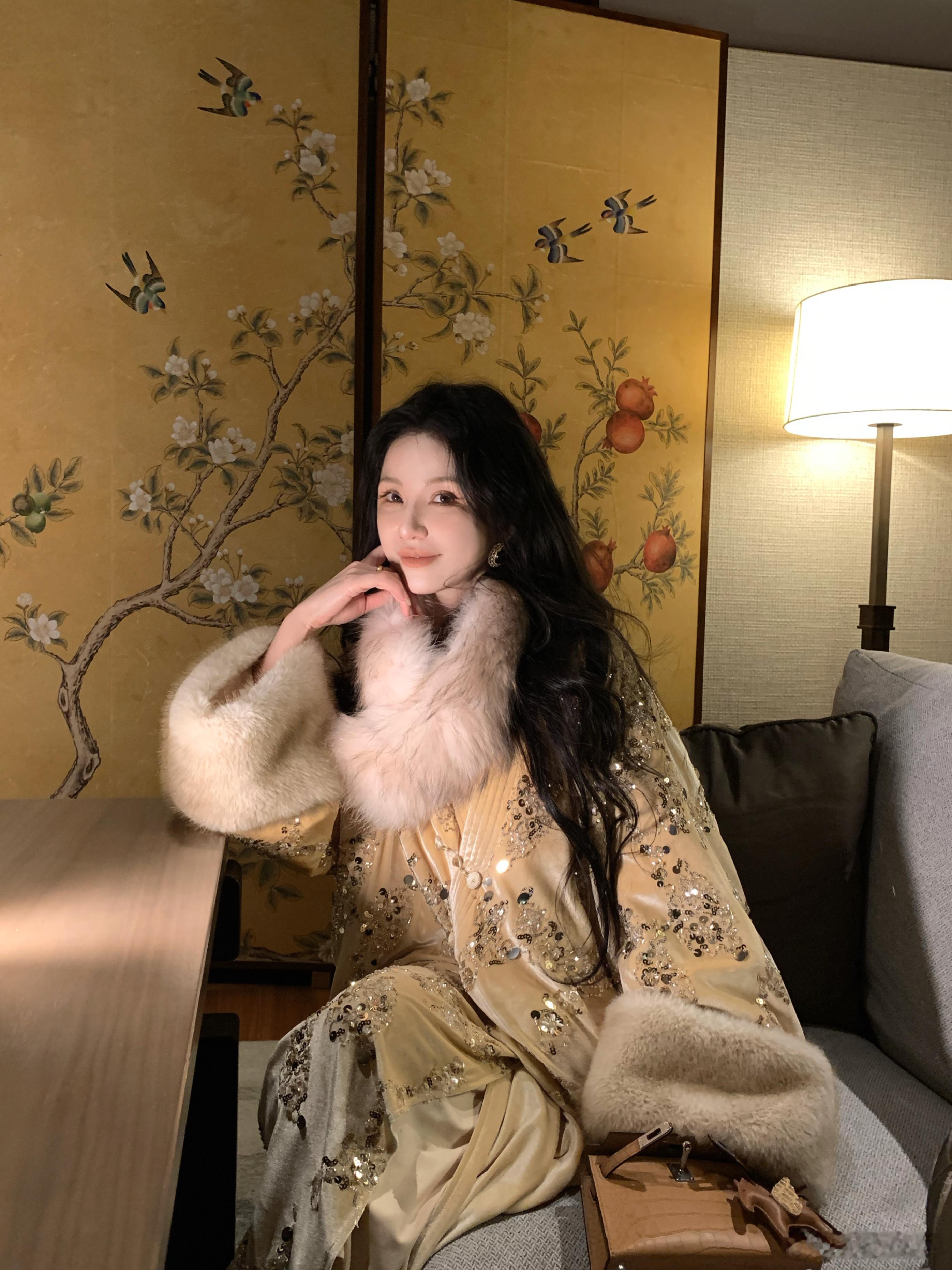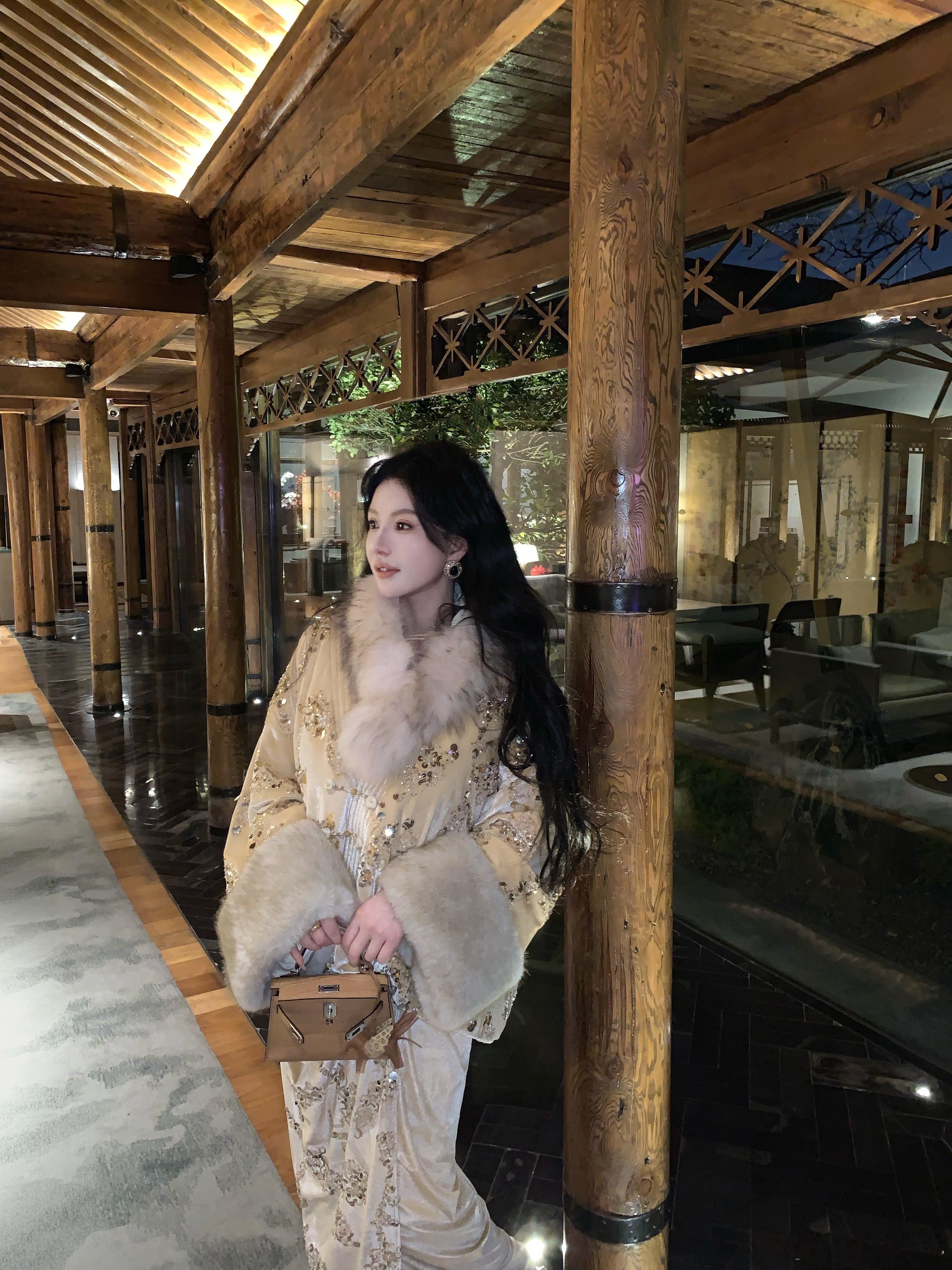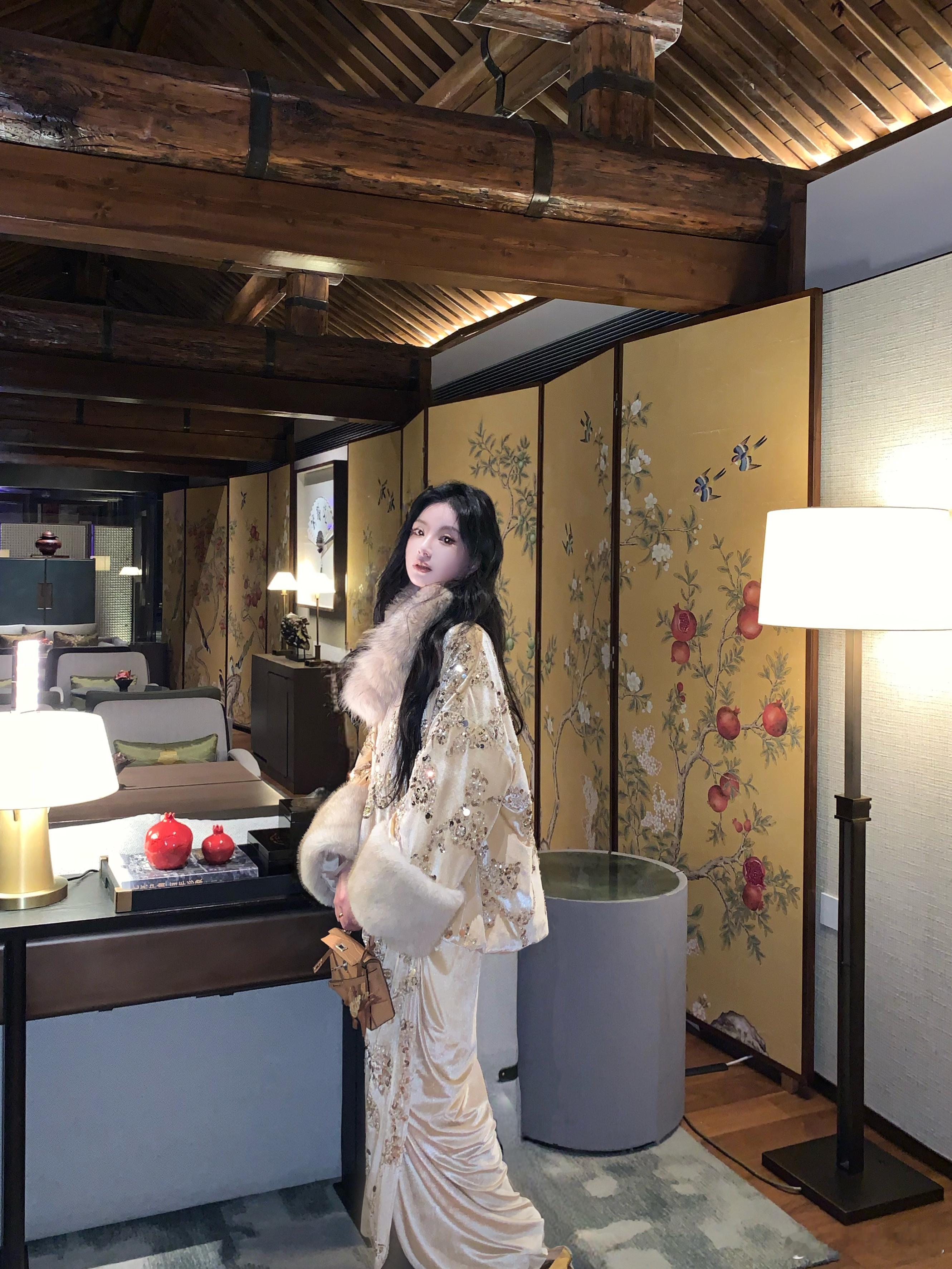 𝑴𝑶𝑺𝑺 𝟏𝟏.𝟑𝟎/𝟐𝟎:𝟎𝟎𝒑𝒎【静檀听晚】🕍🕍新中式原创羽绒服+半裙外套衣服采用了高品质重工珠绣🪡丝绒面料,在杏仁色丝绒基底上勾勒出繁美纹样💫门襟处点缀定制染色金丝一字盘扣🔒内里填充的羽绒,为身体构筑起温暖的屏障🌞半裙白裙采用一片裁设计,单一裁片的立体剪裁与垂坠设计,开衩设计,为整体造型注入独特韵味。裙身的重工亮片绣如星辰洒落✨内里使用了亲肤柔软的拉毛面料,触感柔软亲肤☁️新中式穿搭秋冬穿搭