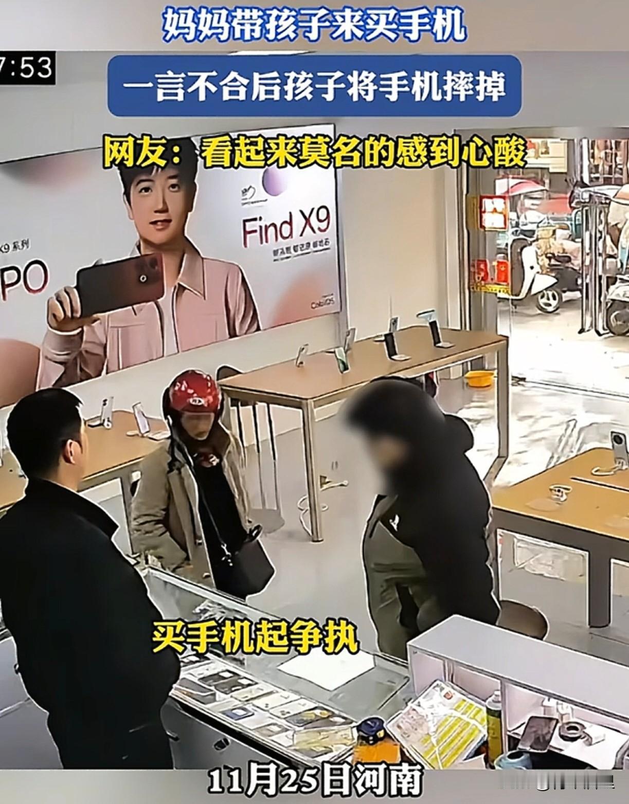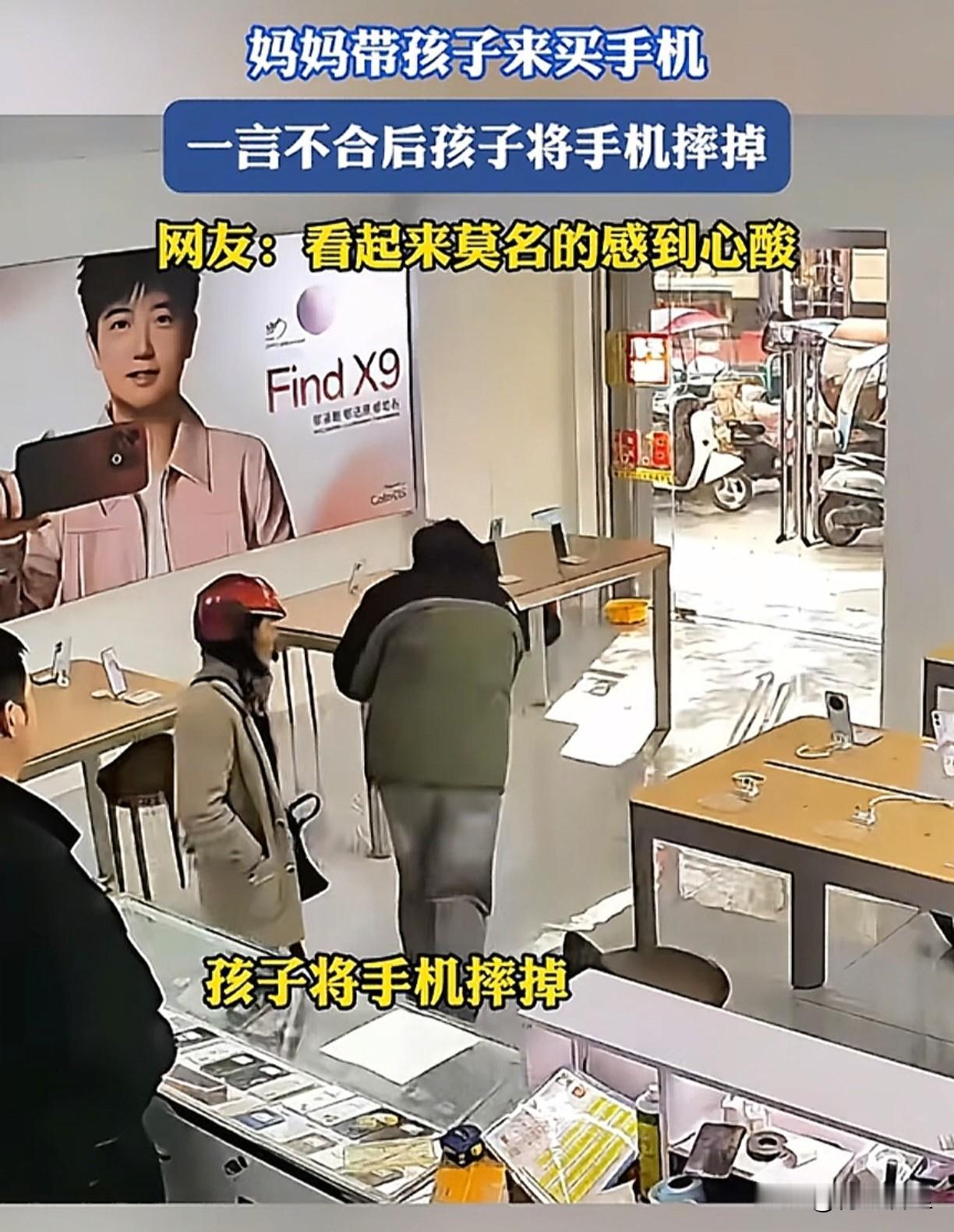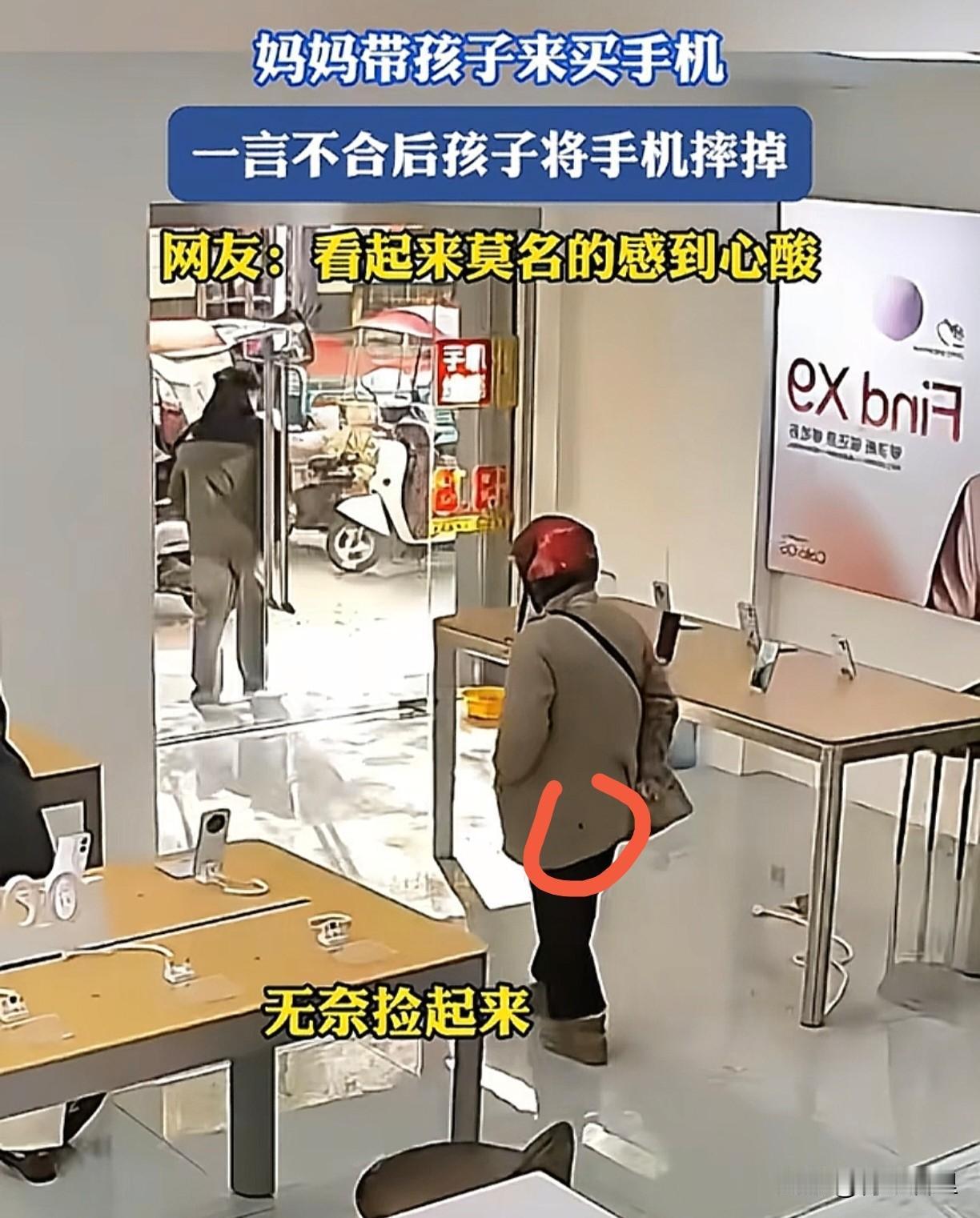 这一幕,真让人挺心酸的。 儿子想要换部新手机,看中了一款,随后让妈妈掏钱。妈妈觉得有些贵,就劝说儿子换一款便宜一点的。儿子不愿意,死死的盯着妈妈,但看着妈妈不松口,随后掏出自己的手机狠狠的摔在地上直接离去。妈妈看着儿子,默默的捡起手机,跟在儿子身后。 可怜天下父母心,儿子长这么大,却没法体会父母的不易。如果他看到,妈妈身上还穿着破洞的外套,不知会作何感想。会不会对自己的举动感到后悔。