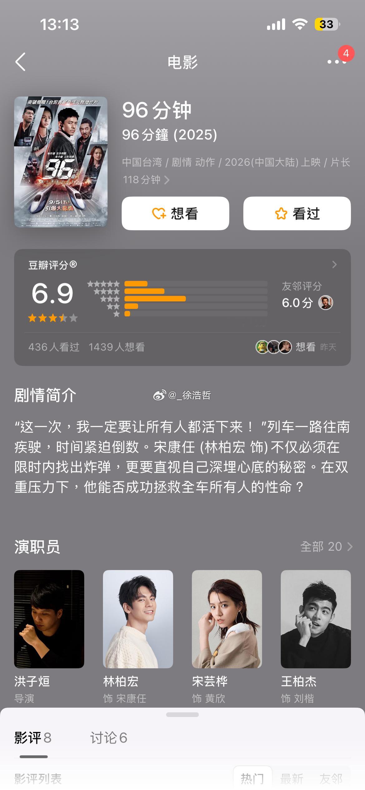 台湾首部高铁灾难动作巨片《96分钟》(大陆译名96分钟:列车爆炸案)已开通官博官抖目前db已开分6.9 电影96分钟林柏宏电影96分钟