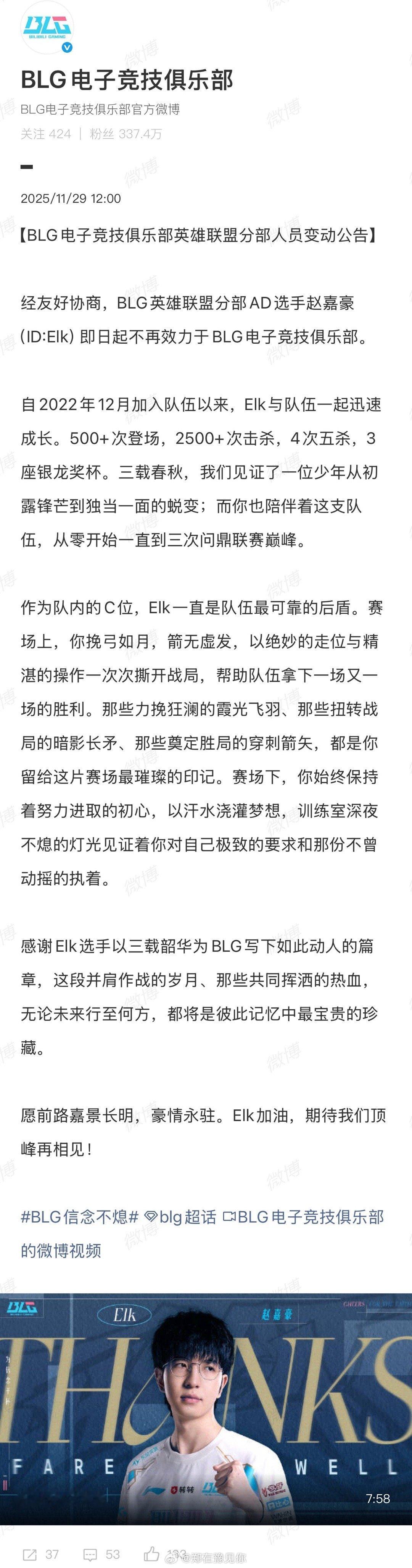 blg官宣elk离队 【BLG电子竞技俱乐部英雄联盟分部人员变动公告】经友好协商,BLG英雄联盟分部AD选手赵嘉豪(ID:Elk)即日起不再效力于BLG电子竞技俱乐部。英雄联盟