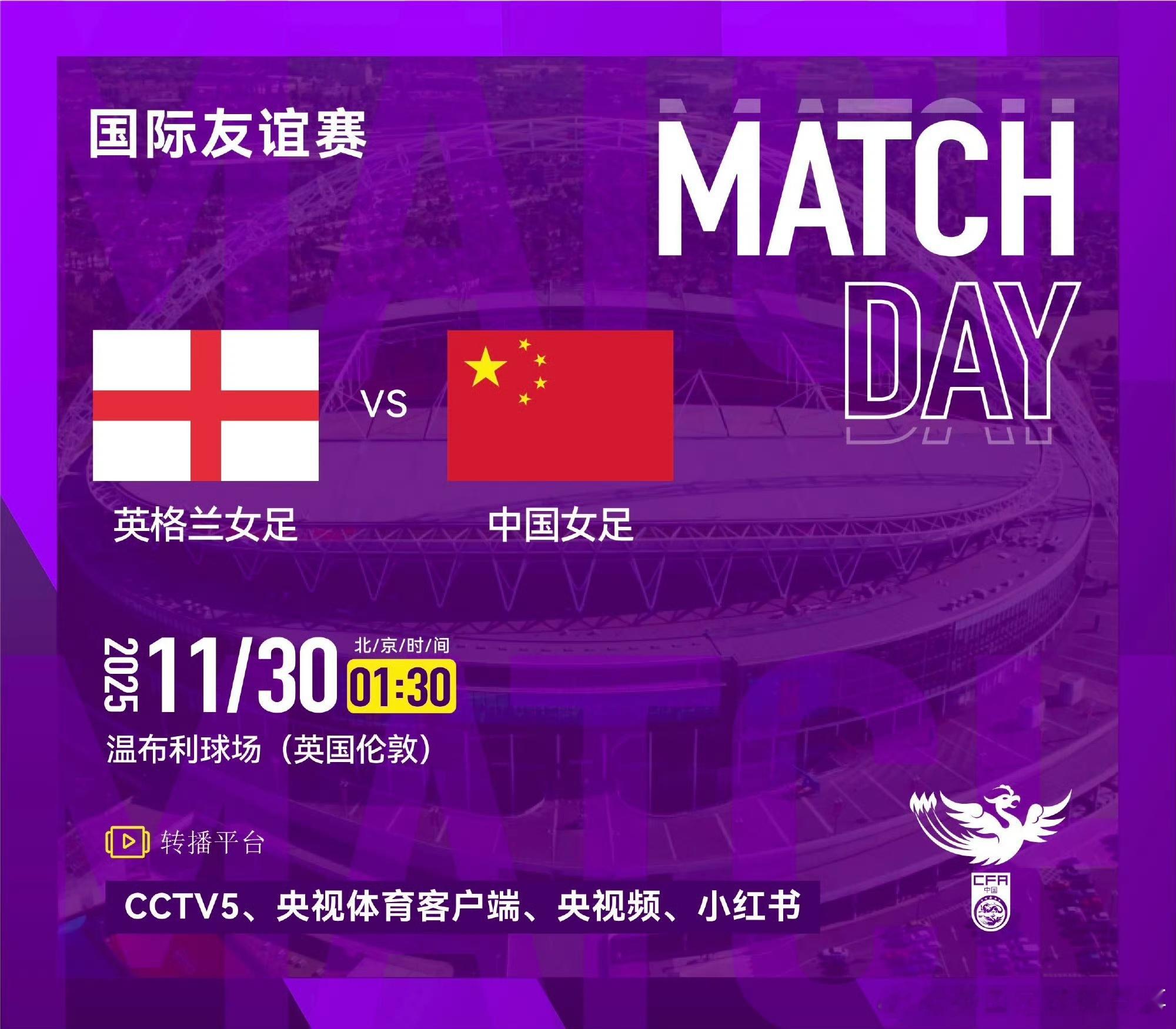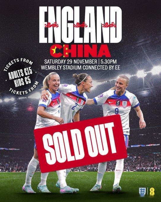 官方:英格兰女足在温布利球场对阵中国女足的门票已全部售罄!❤️🔥英格兰女足vs中国女足 ⏰比赛时间:2025年11月30日01:30(今晚开战)