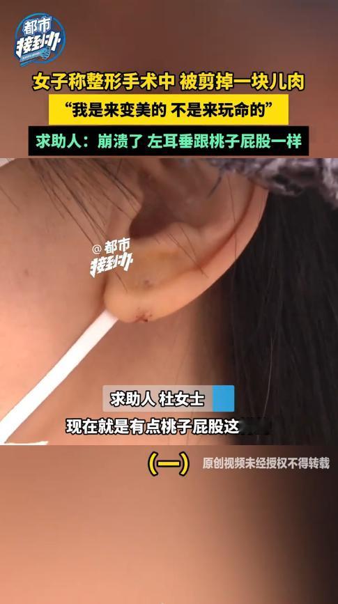 太缺德了!11月15日,河南郑州,一女子花费28000元,在整形医院做手术,结果手术过程中,护士在剪绷带时,不小心剪掉了女子耳朵上的一块肉!院长看后淡定的表示,缝一下长好后就看不出来了。网友:还敢做医美吗? 爱美之心,人皆有之,更何况是女孩子呐,谁不想拥有一个曼妙的身材、一副姣好的容颜,但是大家在选择整形医院时,一定要找那种资质齐全的,不要为了省钱就找小机构。 杜女士一直觉得自己的人中太长了,就想做手术缩短一些,在网上找了好几家医院,她最终选中了一家有过相似案例的手术,最终花了2.8万元做手术。 可是令杜女士没想到的是,这场手术竟差点要了自己的命!手术过程中,护士用剪刀剪她腮部的纱布,却将耳朵上的肉剪了下来。 等到杜女士有直觉后,照了下镜子,这才发现耳朵上有血迹,她将事情反馈给院长后,对方却表示不是什么大问题,缝合一下就能恢复到原样。 杜女士没有怀疑,就又缝了针,可3天后拆除绷带后,她却发现两边的耳朵完全不一样,严重影响了美观,当初那一剪刀要是扎到了脖子,自己甚至连命都没了,要求医院进行赔偿。 医院却表示就是破了个口子而已,根本没有那么夸张,说杜女士是在碰瓷,最终在记者的帮助下,双方愿意坐下来协商处理,争取给杜女士一个满意的答案。 这起事故告诉我们,医疗行业一定要加强对员工的培训,只有平时多下功夫,才能保障关键时刻不掉链子! 信息来源:《女子花2万8整形,耳垂却被剪掉块肉,拆纱布后崩溃:像桃子屁股》新派新闻