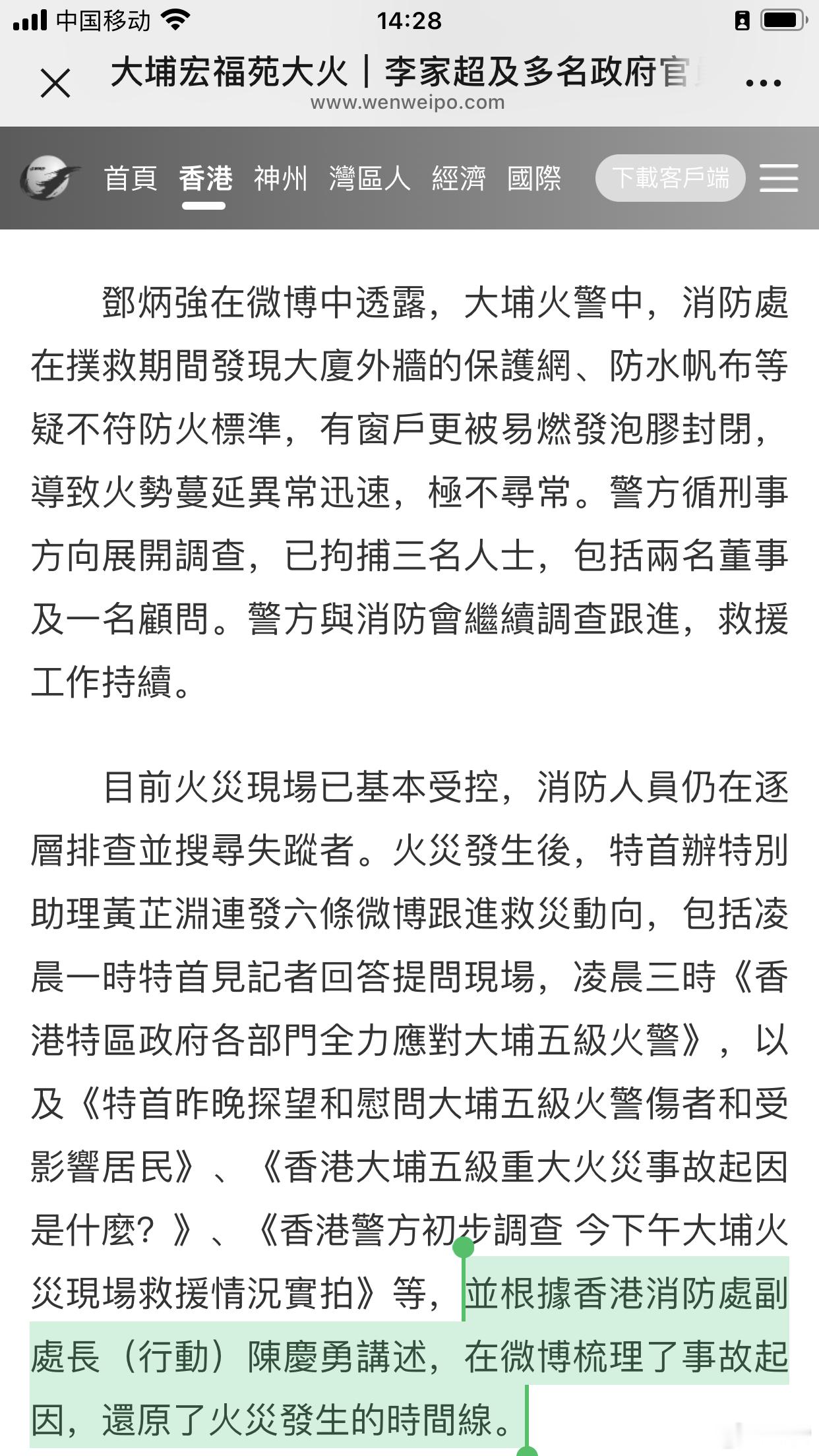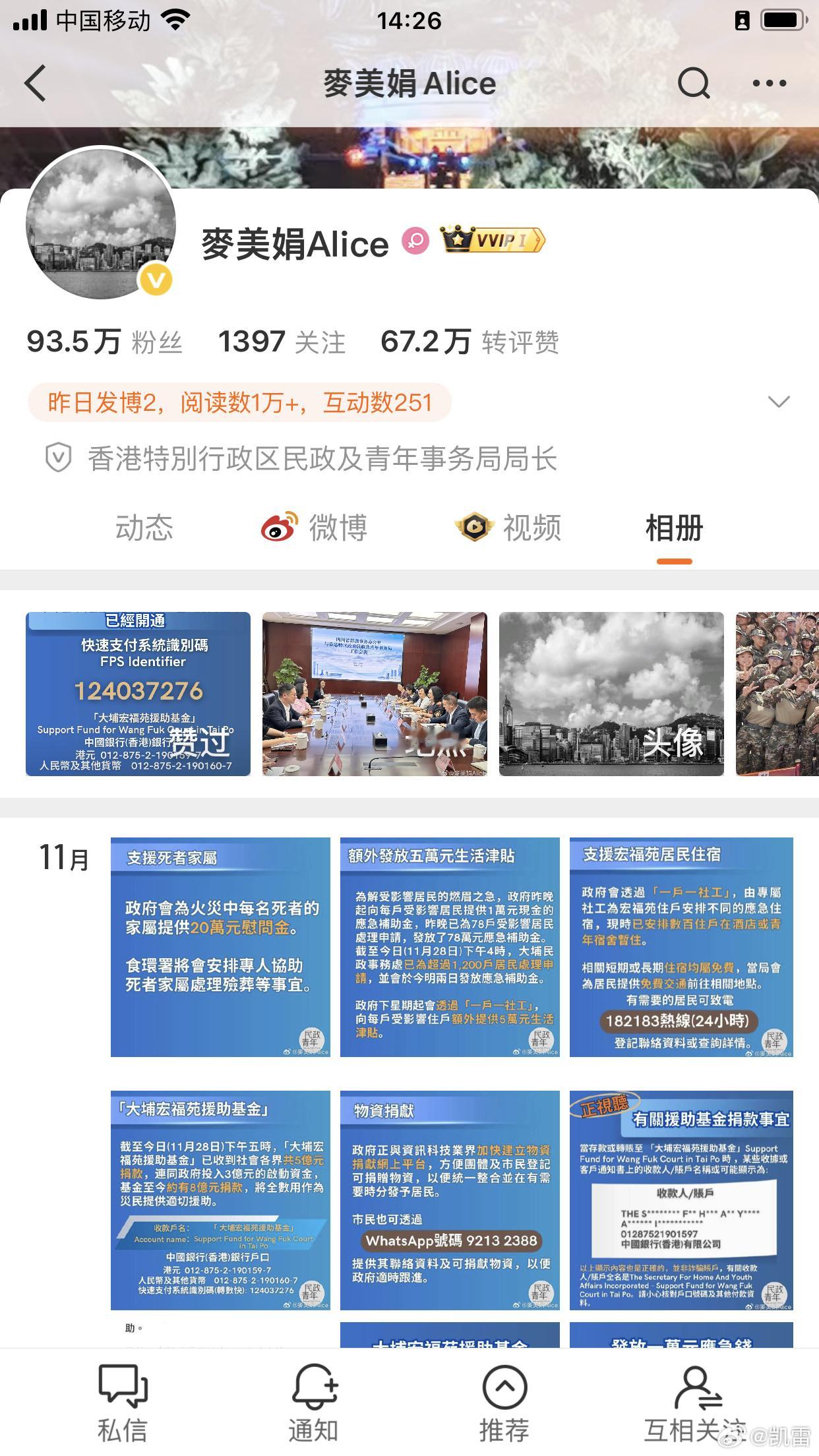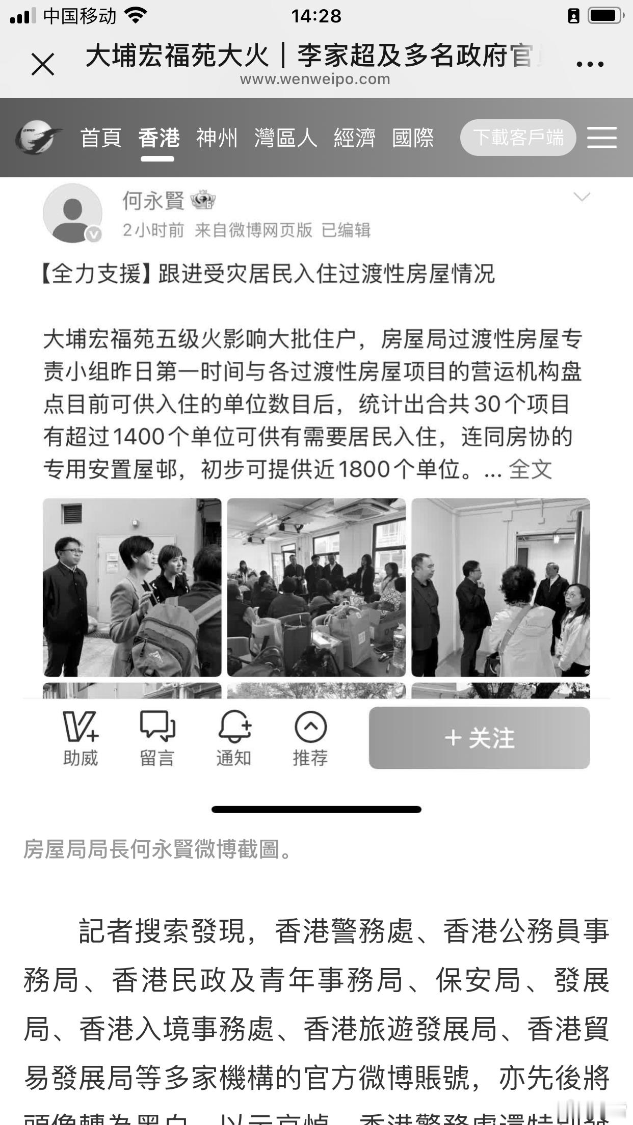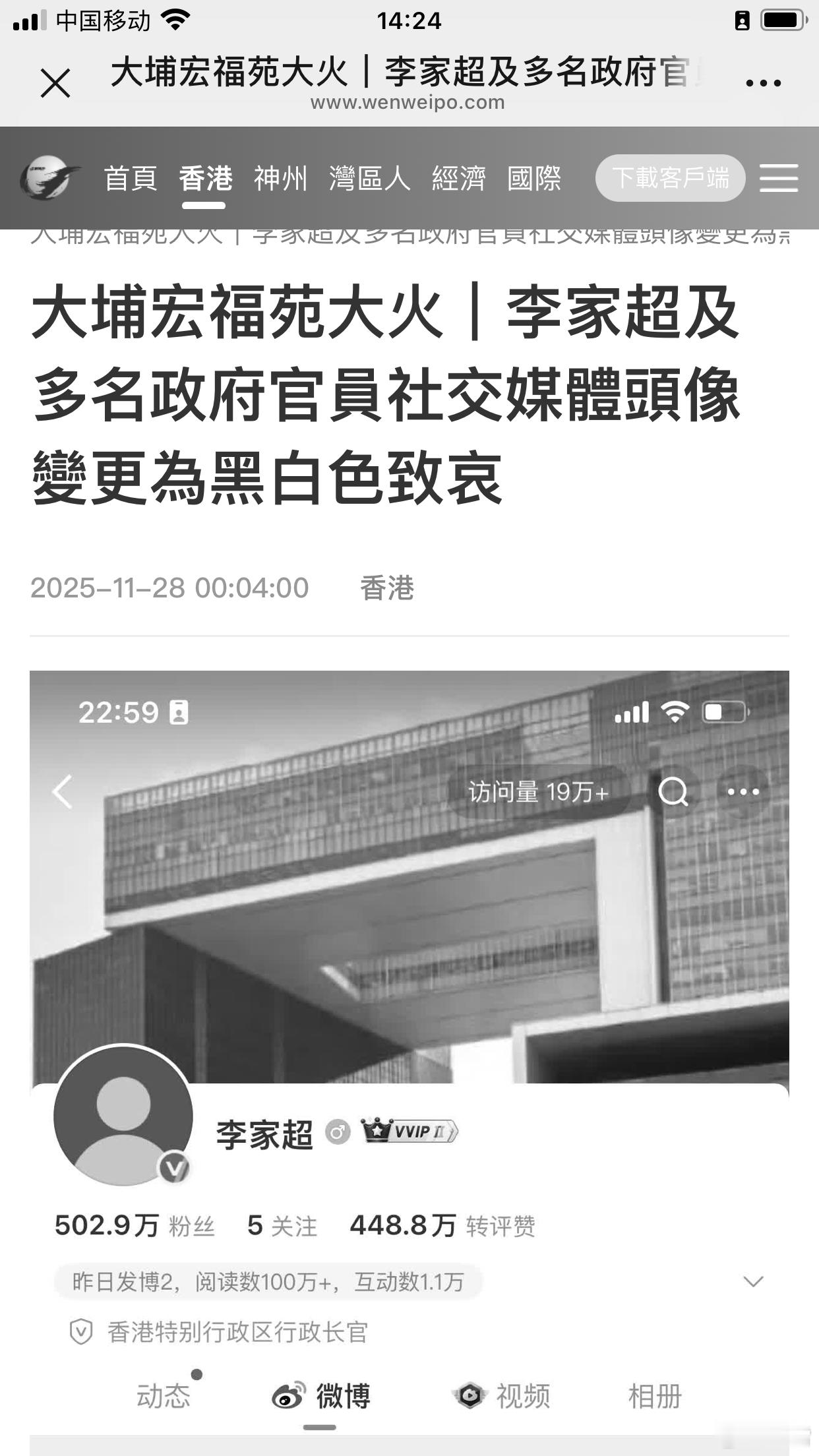 特首李家超及政府高官社交媒体头像变更改黑白色表哀悼各地网友纷纷留言支援香港受灾同胞 内地网友帖捐款截图“献给这个给了很多爱的城市”。 大埔宏福苑大火|李家超及多名政府官員社交媒體頭像變更為黑白色致哀 香港文汇网记者 北京报道 11月26日下午,香港新界大埔宏福苑多栋住宅楼发生严重火灾,造成重大人员伤亡。香港特区政府与社会各界正全力开展灭火、搜救、伤员救治及善后安抚工作。记者注意到,为表达对火灾遇难者的深切哀悼,香港特别行政区行政长官、政务司司长、保安局局长、民政及青年事务局局长、房屋局局长等多位特区政府高官,以及特首办特别助理,均已将其微博个人账号头像及背景更换为黑白色。网友留言表示,“看到头像变灰的一刻,心里非常感动,我们与香港同胞同在”,对特区政府官员及机构集体换头像致哀的行动表示认同,并为受灾市民加油打气,祝愿香港早日渡过难关。 本网透过官微发布政府捐款帐号 网友捐款留言支持表心意 记者注意到,在香港文汇网、大公文汇网设置与发布的微博话题各地网友为香港受灾市民祈福栏目中,网友纷纷留言为香港受灾民祈福。浙江网友贴出捐款截图表示:“远在千里之外不知道能做点什么,一点点心意,献给这个给了我很多爱的城市。逝者安息,生还者及所有救助人员一生平安。”香港本地网友发微博感谢各地同胞为香港祈福,称:“这是一个令人不安和心碎的日子。我也衷心希望火灾扑灭后,失联的居民能顺利平安寻回。” 有网友在、微博留言询问捐款渠道,希望对香港同胞略尽绵力。为方便公众捐款,两网通过官微发布了特区政府公布的中银香港户口,户口号码012-875-219-015-97,11月27日19时起接受港元捐款,基金会用于帮助受影响居民。 警务处、公务员事务局、保安局、民青局、政府发展局社交媒体头像同步变灰 本网记者搜索发现,香港警务处、、香港民政及青年事务局、保安局、、、、等多家机构的官方微博账号,亦先后将头像转为黑白,以示哀悼。香港警务处还特别发布微博,提醒市民警惕借大埔火灾名义进行的虚假筹款,呼吁市民通过可靠渠道捐款,援助受灾群众;香港政府房屋局长最新微博表示:“全力支援受灾居民入住过渡性房屋,可初步提供近1800个单位”;详细介绍“民青团队全力支援大埔宏福苑受影响居民的具体措施”;发布政府【共渡时艰】举措:“为援助大埔宏福苑五级火灾受影响人士,香港政府已成立「大埔宏福苑援助基金」,并投入3亿元作为起动资金,协助居民及支持各项相关工作”。11月27日,香港特区行政长官李家超在微博再次发文表示,政府将继续全力扑灭火灾、救援被困居民及治理伤者,同时全力展开善后支援,为死者家属、伤者及受影响居民提供援助。政府会全力为受影响家庭提供临时住宿,并已安排足够社工,为各个受影响家庭及有需要人士提供适切支援,并会尽快安排提供财政援助,跟进相关善后安排。另外,政府已即时安排巡查全港所有正在进行大型维修的屋苑,检视棚架及建筑物料的安全。 保安局长邓炳强凌晨六时发微:发泡胶封闭 警方循刑事调查 邓炳强在微博中透露,大埔火警中,消防处在扑救期间发现大厦外墙的保护网、防水帆布等疑不符防火标准,有窗户更被易燃发泡胶封闭,导致火势蔓延异常迅速,极不寻常。警方循刑事方向展开调查,已拘捕三名人士,包括两名董事及一名顾问。警方与消防会继续调查跟进,救援工作持续。 目前火灾现场已基本受控,消防人员仍在逐层排查并搜寻失踪者。火灾发生后,特首办特别助理黄芷渊连发六条微博跟进救灾动向,包括凌晨一时特首见记者回答提问现场,凌晨三时《香港特区政府各部门全力应对大埔五级火警》,以及《特首昨晚探望和慰问大埔五级火警伤者和受影响居民》、《香港大埔五级重大火灾事故起因是什么?》、《香港警方初步调查 今下午大埔火灾现场救援情况实拍》等,并根据香港消防处副处长(行动)陈庆勇讲述,在微博梳理了事故起因,还原了火灾发生的时间线。 黄芷渊最新一条微博表示,警方今天分别拘捕三名建筑工程公司男负责人,年龄介乎52至68岁,涉嫌误杀。他们现正被扣留调查。新界北总区重案组正积极调查该宗案件。“警方呼吁任何人如目睹案件发生或有资料提供,请致电+852 55660087与调查人员联络。”记者李畅、凯雷、祝恺祺、王美晴报道 港澳平:行政长官和特区政府对事故的快速有力响应和积极有效处置,充分体现作为“当家人”、“第一责任人”的担当和勇毅。香港举行悼念活动 新华社快讯:29日上午,香港特区行政长官李家超、特区政府主要官员和公务员等在政府总部举行悼念活动,哀悼大埔宏福苑火灾中不幸罹难的人士。特区政府建筑物国旗和区旗下半旗。香港下半旗志哀 沉痛哀悼香港大埔火灾罹难者