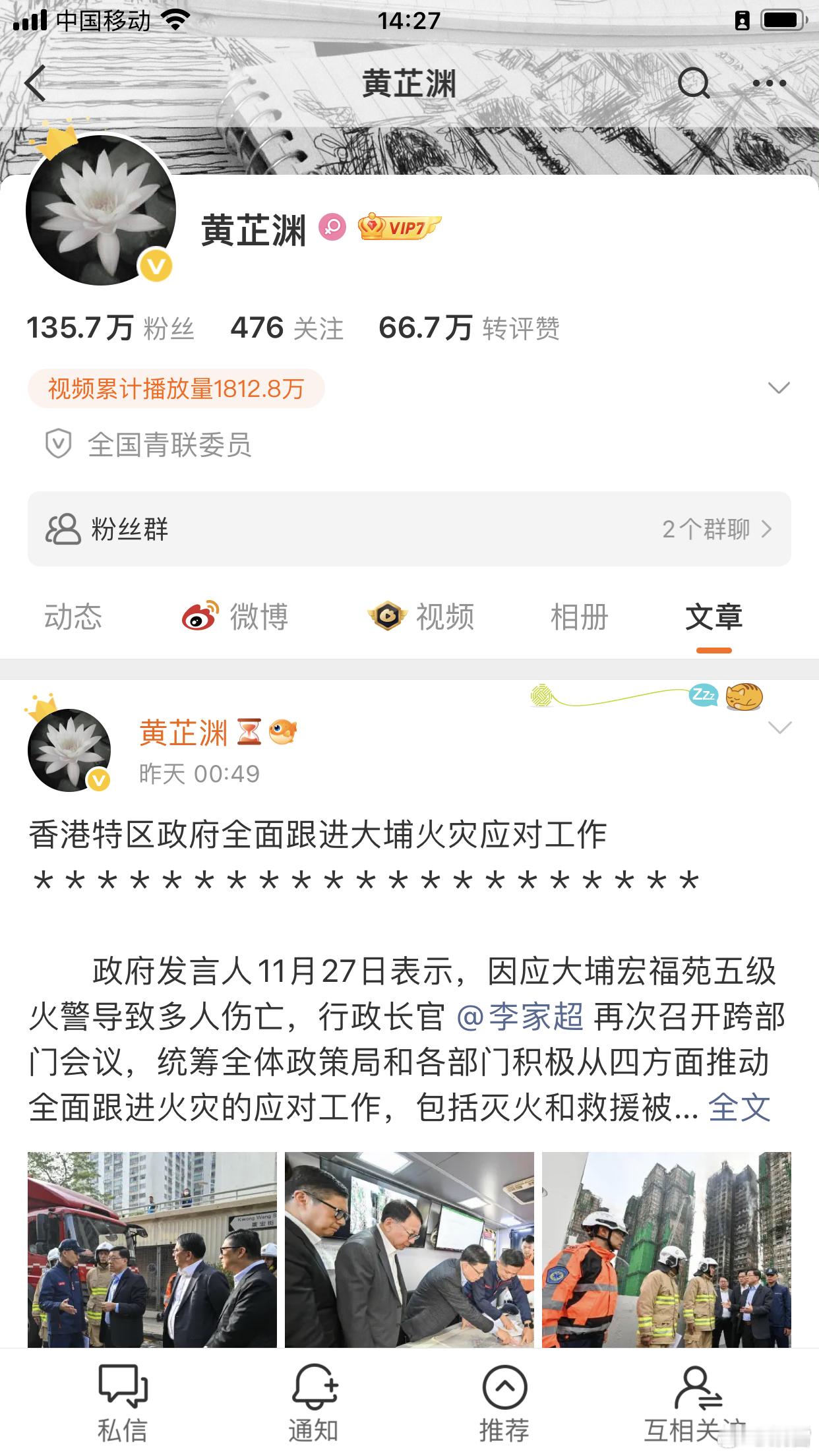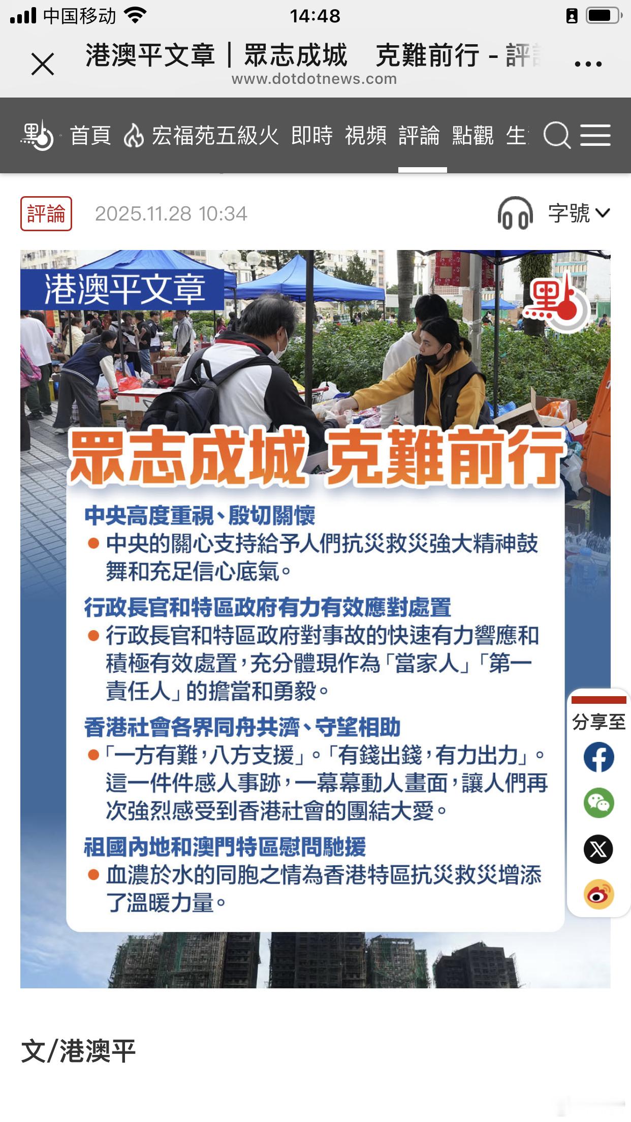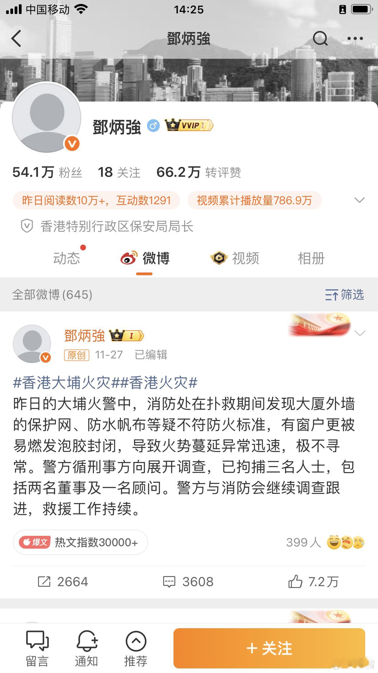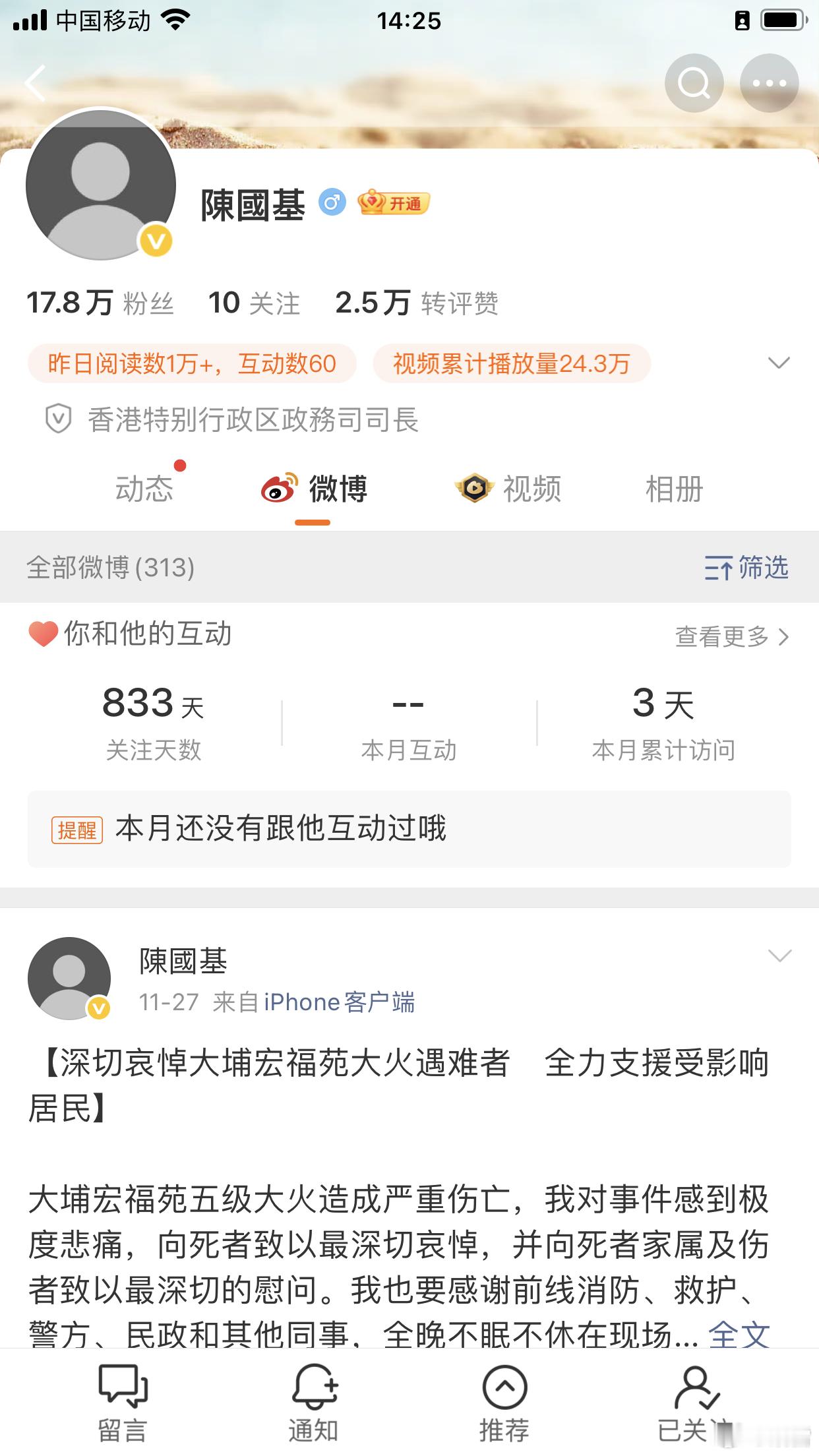 特首李家超及政府高官社交媒体头像变更改黑白色表哀悼各地网友纷纷留言支援香港受灾同胞 内地网友帖捐款截图“献给这个给了很多爱的城市”。 大埔宏福苑大火|李家超及多名政府官員社交媒體頭像變更為黑白色致哀 香港文汇网记者 北京报道 11月26日下午,香港新界大埔宏福苑多栋住宅楼发生严重火灾,造成重大人员伤亡。香港特区政府与社会各界正全力开展灭火、搜救、伤员救治及善后安抚工作。记者注意到,为表达对火灾遇难者的深切哀悼,香港特别行政区行政长官、政务司司长、保安局局长、民政及青年事务局局长、房屋局局长等多位特区政府高官,以及特首办特别助理,均已将其微博个人账号头像及背景更换为黑白色。网友留言表示,“看到头像变灰的一刻,心里非常感动,我们与香港同胞同在”,对特区政府官员及机构集体换头像致哀的行动表示认同,并为受灾市民加油打气,祝愿香港早日渡过难关。 本网透过官微发布政府捐款帐号 网友捐款留言支持表心意 记者注意到,在香港文汇网、大公文汇网设置与发布的微博话题各地网友为香港受灾市民祈福栏目中,网友纷纷留言为香港受灾民祈福。浙江网友贴出捐款截图表示:“远在千里之外不知道能做点什么,一点点心意,献给这个给了我很多爱的城市。逝者安息,生还者及所有救助人员一生平安。”香港本地网友发微博感谢各地同胞为香港祈福,称:“这是一个令人不安和心碎的日子。我也衷心希望火灾扑灭后,失联的居民能顺利平安寻回。” 有网友在、微博留言询问捐款渠道,希望对香港同胞略尽绵力。为方便公众捐款,两网通过官微发布了特区政府公布的中银香港户口,户口号码012-875-219-015-97,11月27日19时起接受港元捐款,基金会用于帮助受影响居民。 警务处、公务员事务局、保安局、民青局、政府发展局社交媒体头像同步变灰 本网记者搜索发现,香港警务处、、香港民政及青年事务局、保安局、、、、等多家机构的官方微博账号,亦先后将头像转为黑白,以示哀悼。香港警务处还特别发布微博,提醒市民警惕借大埔火灾名义进行的虚假筹款,呼吁市民通过可靠渠道捐款,援助受灾群众;香港政府房屋局长最新微博表示:“全力支援受灾居民入住过渡性房屋,可初步提供近1800个单位”;详细介绍“民青团队全力支援大埔宏福苑受影响居民的具体措施”;发布政府【共渡时艰】举措:“为援助大埔宏福苑五级火灾受影响人士,香港政府已成立「大埔宏福苑援助基金」,并投入3亿元作为起动资金,协助居民及支持各项相关工作”。11月27日,香港特区行政长官李家超在微博再次发文表示,政府将继续全力扑灭火灾、救援被困居民及治理伤者,同时全力展开善后支援,为死者家属、伤者及受影响居民提供援助。政府会全力为受影响家庭提供临时住宿,并已安排足够社工,为各个受影响家庭及有需要人士提供适切支援,并会尽快安排提供财政援助,跟进相关善后安排。另外,政府已即时安排巡查全港所有正在进行大型维修的屋苑,检视棚架及建筑物料的安全。 保安局长邓炳强凌晨六时发微:发泡胶封闭 警方循刑事调查 邓炳强在微博中透露,大埔火警中,消防处在扑救期间发现大厦外墙的保护网、防水帆布等疑不符防火标准,有窗户更被易燃发泡胶封闭,导致火势蔓延异常迅速,极不寻常。警方循刑事方向展开调查,已拘捕三名人士,包括两名董事及一名顾问。警方与消防会继续调查跟进,救援工作持续。 目前火灾现场已基本受控,消防人员仍在逐层排查并搜寻失踪者。火灾发生后,特首办特别助理黄芷渊连发六条微博跟进救灾动向,包括凌晨一时特首见记者回答提问现场,凌晨三时《香港特区政府各部门全力应对大埔五级火警》,以及《特首昨晚探望和慰问大埔五级火警伤者和受影响居民》、《香港大埔五级重大火灾事故起因是什么?》、《香港警方初步调查 今下午大埔火灾现场救援情况实拍》等,并根据香港消防处副处长(行动)陈庆勇讲述,在微博梳理了事故起因,还原了火灾发生的时间线。 黄芷渊最新一条微博表示,警方今天分别拘捕三名建筑工程公司男负责人,年龄介乎52至68岁,涉嫌误杀。他们现正被扣留调查。新界北总区重案组正积极调查该宗案件。“警方呼吁任何人如目睹案件发生或有资料提供,请致电+852 55660087与调查人员联络。”记者李畅、凯雷、祝恺祺、王美晴报道 港澳平:行政长官和特区政府对事故的快速有力响应和积极有效处置,充分体现作为“当家人”、“第一责任人”的担当和勇毅。香港举行悼念活动 新华社快讯:29日上午,香港特区行政长官李家超、特区政府主要官员和公务员等在政府总部举行悼念活动,哀悼大埔宏福苑火灾中不幸罹难的人士。特区政府建筑物国旗和区旗下半旗。香港下半旗志哀 沉痛哀悼香港大埔火灾罹难者