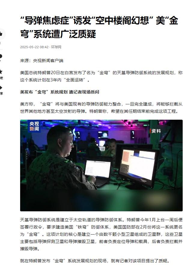 莫非美国真的嗅到了什么巨大危险? 不然根本没法解释特朗普这波操作 —— 拿出 1750 亿美元砸向一个能把整个美国罩住的 “金穹” 防御系统,号称能拦下来自地球任何角落甚至太空的导弹。 这笔钱可不是小数目,首笔 250 亿美元启动资金还是从即将突破万亿的军费里挤出来的,要知道美国联邦债务已经高得吓人,不是真感受到了迫在眉睫的威胁,绝不会在这种时候干这种烧钱的事。 先看最直接的危险信号,就是美国在导弹防御上的 “底气不足”。 这些年其他国家的高超音速导弹发展太快,美国自己反倒落在了后面,这让五角大楼患上了 “导弹焦虑症”。 这种导弹速度能达到 5 马赫以上,还能在飞行中随意变轨,传统反导系统根本没法预判轨迹。 美国现有的 “萨德”“爱国者” 这些系统,原本是拦弹道导弹的,对付这种灵活的高超音速武器基本没用。 去年以色列用 “萨德” 拦过一枚高超音速导弹,之后就再也没敢用,说白了就是成功率太低。 更要命的是,美国连个标准的高超音速靶弹都造不出来,连模拟拦截测试都没法好好做,等于自家大门在这种武器面前基本是虚掩着的,这种技术上的被动,能不让美国慌吗? 再往深了说,太空的威胁已经摆到了台面上。 “金穹” 特意强调能拦截太空来的导弹,这可不是空穴来风。 现在太空军事化越来越明显,反卫星武器、太空导弹的技术都在进步,要是对手在太空部署了武器,从太空打下来的导弹根本没法用传统地面系统拦截。 美国早在冷战时就搞过 “星球大战” 计划,后来因为技术不行放弃了,现在重提天基防御系统,把上千颗卫星组成拦截网,本质上就是怕在太空这个新战场落后,被人从头顶打开突破口。 之前美军一直把重心放在海外作战,现在 2025 年的《国防战略》草案直接把本土防御放在了最前面,比对付所谓 “大国竞争” 还优先,这说明美国已经意识到,本土不再是绝对安全的后方了。 更现实的是,美国现有防御系统的漏洞太大了。 陆基中段防御系统、海基 “宙斯盾” 这些装备,看似覆盖全面,实则各有各的毛病。 “萨德” 系统的雷达只能看 200 公里远,一次拦不住就没第二次机会;“宙斯盾” 虽然能拦洲际导弹,但面对多方向同时来袭的目标根本顾不过来。 现在导弹技术还在升级,不光能从地面发射,还能从舰艇、飞机甚至太空发射,传统防御网就像到处是窟窿的筛子。 “金穹” 想把这些零散的系统整合起来,搞成从助推段到末段的全程拦截,说白了就是现有家底实在撑不住了,只能另起炉灶赌一把。 还有个细节能说明问题,特朗普说 1750 亿就能搞定,但国会预算办公室算出来总成本可能高达 5420 亿。 就算知道要超支,还要硬上,甚至把军费堆到万亿级别,这背后必然是安全压力逼出来的。 军工复合体或许能从中赚钱,但如果没有真实的威胁感知,根本没法说服国会通过这么庞大的预算。 而且 “金穹” 被骂成 “星球大战 2.0”,当年里根搞星球大战就是因为怕苏联导弹,现在美国重走老路,只能说明眼前的危险信号比冷战时还要强烈。 说到底,美国砸千亿建 “金穹”,绝不是心血来潮。 高超音速导弹的技术代差、太空军事化的新威胁、现有防御系统的致命漏洞,再加上国防战略向本土防御的紧急转向,这些信号堆在一起,显然是美国嗅到了前所未有的安全风险。 这个 “金穹” 能不能建成另说,但它透露出的,是美国对自身安全处境的深度焦虑,这背后的危险感知,才是最值得琢磨的。