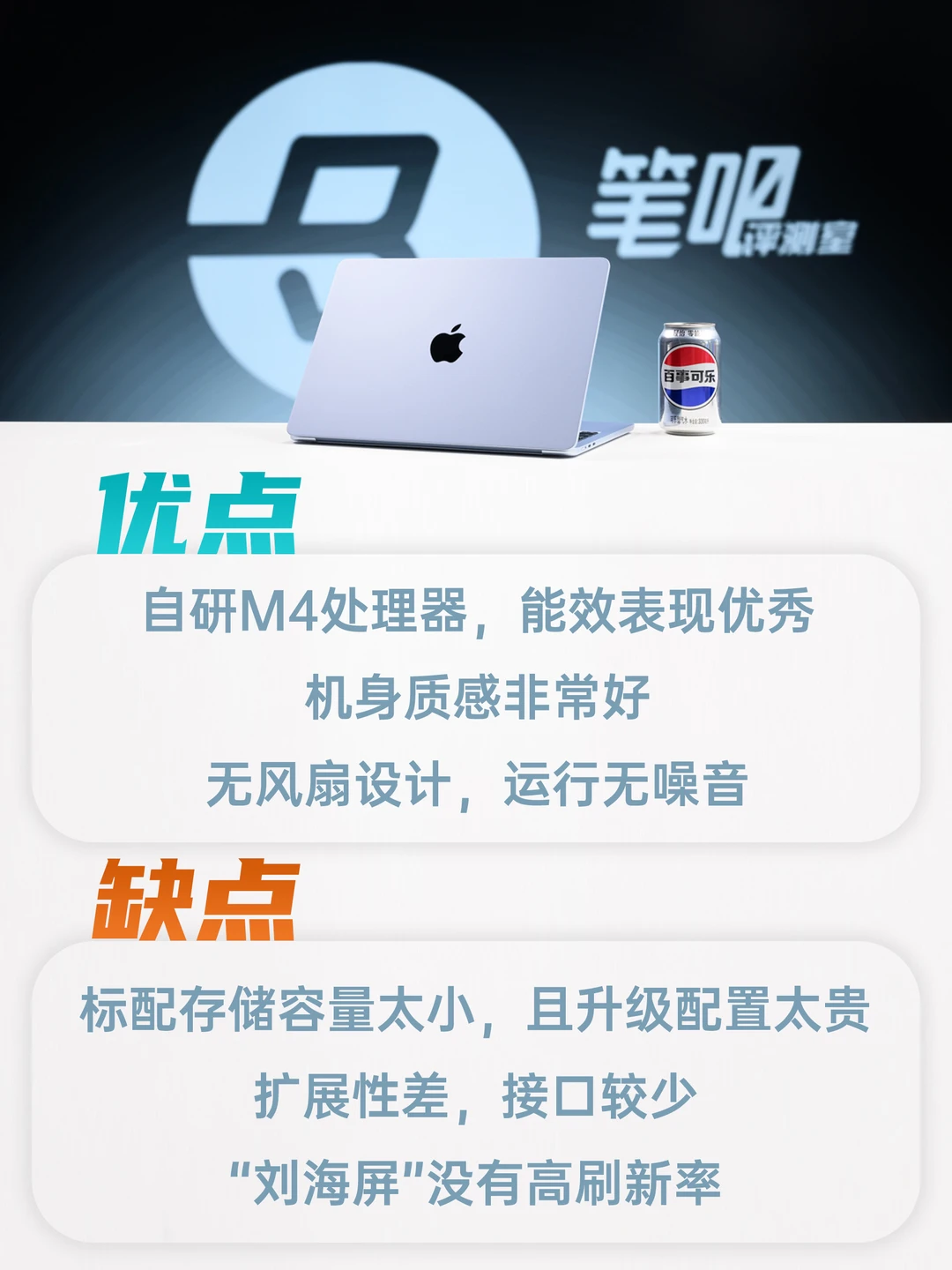 说到高端笔记本电脑,恐怕很多人的脑海中第一个闪过的就是MacBook了,它的溢价能力超群,即使把内存和硬盘卖得和金子一样贵,也有大量用户心甘情愿为它掏钱。 不过,情况在今年却发生了很大的变化,一向高贵的MacBook今年一下变得“良心”了起来。[抠鼻R] 以今天这台M4入门款MacBook Air为例,我们首发测试时,它的售价是7️⃣9️⃣9️⃣9️⃣,国补后6️⃣3️⃣9️⃣9️⃣,在国补收紧后,它价格不升反降,目前政补到手价5️⃣8️⃣8️⃣9️⃣·1️⃣。 它的优缺点如下: 优点👍 ✅自研M4处理器,能效表现优秀 ✅机身质感非常好 ✅无风扇设计,运行无噪音 缺点👎 ❌标配存储容量太小,且升级配置太贵 ❌扩展性差,接口较少 ❌“刘海屏”没有高刷新率 虽然国补之外现在还有政补,但补贴力度和国补的20%相去甚远,绝大多数笔记本电脑的价格都上涨了。 在这个大背景下,苹果 MacBook Air现在的政补到手价居然比首发时的国补价更低,这是十分罕见的。[大笑R] 虽然MacBook Air的入手门槛依旧不低,接近六千元的售价只能买到16+256的内硬配置,对比Windows笔记本,这肯定是贵的。[萌萌哒R] 但如果纵向和苹果自己比较,那么今年入门款给到了16GB内存,可用性大幅提高,同时入手价格还降低了,相对性价比一下子就来了。 而且M4本身的进步幅度也是比较大的。[赞R] 在我看来,苹果这两年的策略转变有目共睹,不再和以往那样“高冷”,变得“接地气”了起来:不仅官方参与电商促销,还积极开拓新的销售渠道(),连库克都来中国“直播带货”了。 而在另一边,面对越来越接地气的苹果,Windows高端轻薄本的路,恐怕会变得更难走了。[doge]