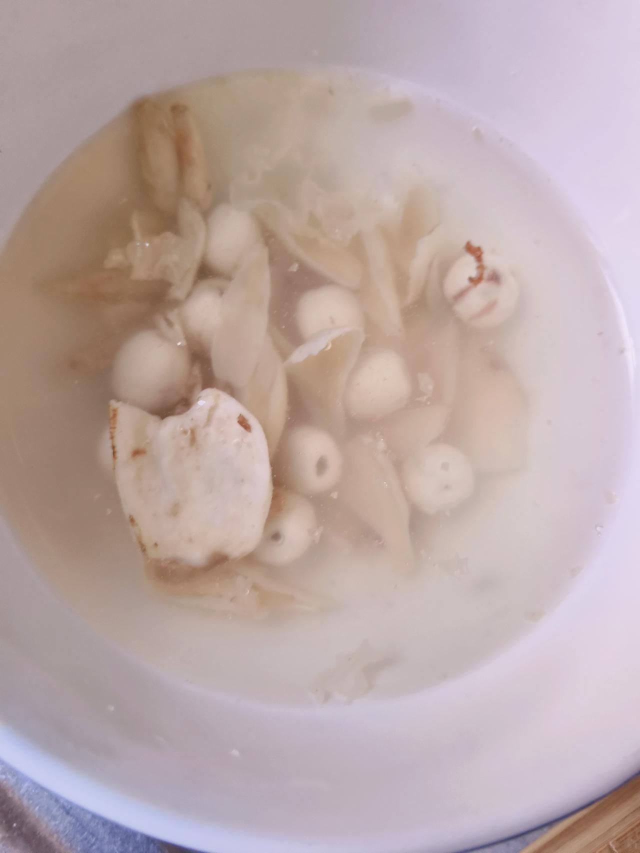 莲子怎么处理?太干了,不能直接下锅,泡半个小时以后,也不能直接下锅,用刀拍碎了,用不着太细碎,莲子上面浮着的一圈就像黑眼球一样的膜也顺便剥出去。把绿色的莲子芯抽出来,莲子心苦寒撤火,但是煮起来那个汤的味道就不好了。 今天做一款养肺润燥解腻除烦养生汤:银耳、百合、莲子、桂圆、冰糖。搁水泡一泡半小时,然后尽量把材料加工碎一点,在养生壶里选择银耳一档,人家就自动开战,两小时结束战斗。一开始浮沫子比较多,用手撇两次基本差不多可以。 一般一周喝一次,总感觉挺舒服,有时候放大枣,但是那个汤色浑浊,味道也有点不正,不如这样比较清亮,没有什么味道,微微有点甜,喝起来挺舒服。
