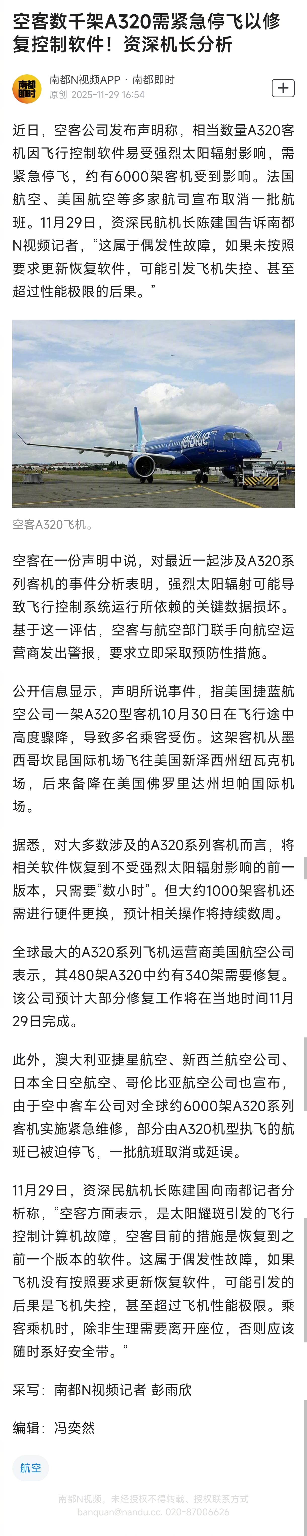 #资深机长分析空客召回数千飞机#【空客数千架A320需紧急停飞以修复控制软件!资深机长分析】近日,空客公司发布声明称,相当数量A320客机因飞行控制软件易受强烈太阳辐射影响,需紧急停飞,约有6000架客机受到影响。法国航空、美国航空等多家航司宣布取消一批航班。11月29日,资深民航机长陈建国告诉南都N视频记者,“这属于偶发性故障,如果未按照要求更新恢复软件,可能引发飞机失控、甚至超过性能极限的后果。”空客在一份声明中说,对最近一起涉及A320系列客机的事件分析表明,强烈太阳辐射可能导致飞行控制系统运行所依赖的关键数据损坏。基于这一评估,空客与航空部门联手向航空运营商发出警报,要求立即采取预防性措施。公开信息显示,声明所说事件,指美国捷蓝航空公司一架A320型客机10月30日在飞行途中高度骤降,导致多名乘客受伤。这架客机从墨西哥坎昆国际机场飞往美国新泽西州纽瓦克机场,后来备降在美国佛罗里达州坦帕国际机场。据悉,对大多数涉及的A320系列客机而言,将相关软件恢复到不受强烈太阳辐射影响的前一版本,只需要“数小时”。但大约1000架客机还需进行硬件更换,预计相关操作将持续数周。