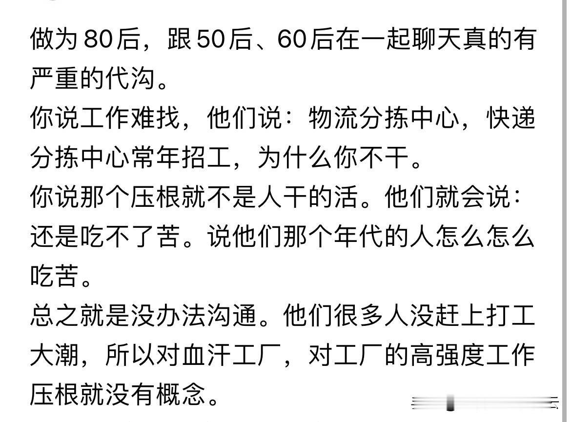 有人吐槽说老一辈50后、60后的人真的是不懂现在年轻人的苦。 现在的年轻人打工几乎很多是996加班加点被资本家压榨的不行。 哪像他们50后、60后以前工作的那个年代,劳动最光荣,进工厂需要靠关系介绍,而且在里面工作几乎是吃大锅饭。 他们那个时代最严重的辛苦也就三班倒吧,加班也没有现在这么厉害,几乎是属于8小时工作制,如果要加班还得写申请请求批准。 所以这两个时代真的是天壤之别,根本就没有一点的可比性。 现在这个年代,普通人都被996和887压榨的不要不要,这就是80后90后这一代年轻人最普遍的现象。 所以拜托,请真的不要说他们不能吃苦了,不是他们的错,而是我们这个社会发展太快,发展的成果被窃取了,形态太过于畸形。 没有一个良好的生态环境,还怎么有信心孕育下一代,奔向未来呢?[泪奔]