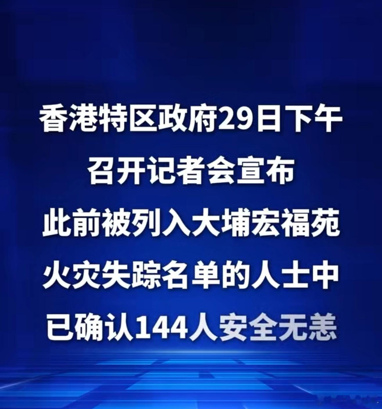 此前失踪名单中144人确认安全香港大埔火灾失踪的144人都确认安全了,真让人踏实