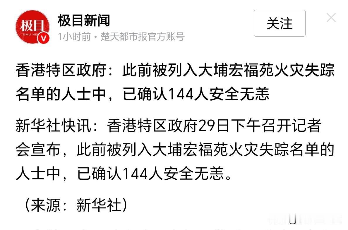 看到144人平安的消息,“终于松了口气”心里宽慰了许多。这场火灾从发生到现在,每一个相关消息都让人揪心,失联人数、伤亡情况总是那么冰冷刺骨,总怕看到更糟的结果。 确认这么多人安全无恙,既为他们和家人感到庆幸,也忍不住共情那些仍在等待失联亲人消息的家庭——每一分等待都是煎熬,只盼后续能有更多好消息传来。同时也被救援人员的坚守打动,火灾现场的危险、搜救工作的艰辛难以想象,他们争分夺秒的努力,才换来了这些让人安心的结果。 灾难面前,生命的脆弱总是让人动容,但人与人之间的守望相助也格外温暖。从政府的紧急安置到社会各界的捐款捐物,从义工的默默付出到普通市民的牵挂,这些善意让冰冷的灾难多了些温度。只愿逝者安息,伤者早日康复,失联的人能平安归来。