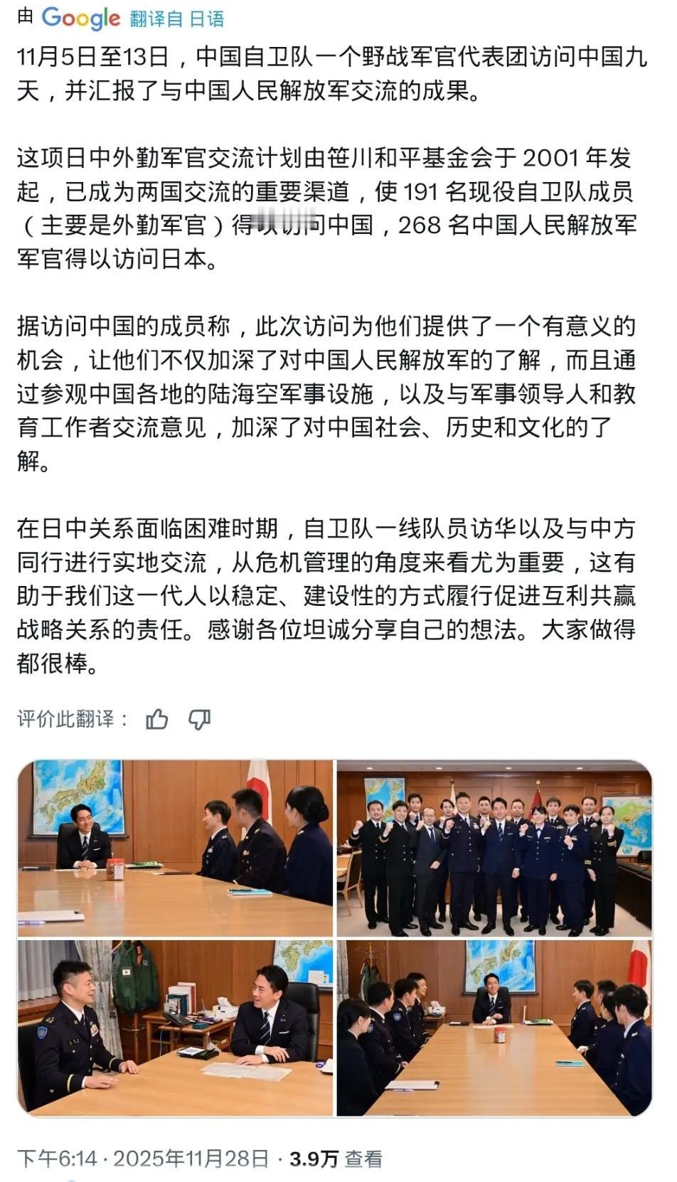 日本防务大臣小泉进次郎昨天(11月28日)发文写道:从11月5日至11月13日对中国进行了为期9天访问的自卫队佐官级访华团,汇报了与中国人民解放军交流成果。 中日佐官级交流项目是由笹川和平基金会于2001年发起,迄今为止,共有191名以佐官级为中心的现役自卫官访华,268名中国人民解放军的军官访日,是两国交流的重要渠道。 访华的人员表示,他们参观了中国各地的陆、海、空军事设施,并与军队干部和教育工作者交换了意见,不仅了解了中国人民解放军,还了解了中国的社会、历史和文化。这是个加深理解的有意义的机会。 这则消息在当下中日关系的大背景下,显得格外有嚼头。官方层面的互动时常带着一丝谨慎和距离感,而这样一个由民间基金会推动的军方交流项目,却像一股潜流,二十多年来从未断过。 很多人可能会好奇,笹川和平基金会到底是个什么样的存在,能让两国的现役军人坐到一起? 这个基金会源于日本,但长期以来致力于推动国际间的文化交流与和平对话,它扮演的角色更像是一个“桥梁建设者”,搭建了许多官方不便直接出面的沟通渠道。这种“二轨外交”的独特价值,在两国关系遇冷时,反而更加凸显出来。 这次访华的,是日本自卫队的“佐官”。这个级别的军官,可不是普通的士兵,他们是军队里的中坚力量,是未来的高级将领,是连接高层战略与基层战术的关键枢纽。 他们看待问题,既有宏观的战略视野,又有具体的战术考量。让他们来中国,看看解放军的营房、摸摸我们的装备、和同级别的军官聊聊日常训练和部队管理,这种交流远比外交辞令来得实在。 他们回去后写的报告,会直接影响到日本防卫省对未来中国军队发展的判断。这趟旅程,对他们而言,不仅仅是完成一次任务,更是一次更新认知数据库的过程。 有意思的是,日方人员特别提到,除了军事设施,他们还了解了中国的社会、历史和文化。这一点非常关键。如果只是走马观花地看看武器装备,那叫“军事情报搜集”,但深入到社会文化层面,那才叫“理解”。 理解一个国家的军人,就不能脱离他生长的土壤。或许他们去了北京的胡同感受了市井生活,或许在西安的兵马俑前思考了历史的厚重,又或许和中国的军事院校教授探讨了两国的国防观念差异。 这些看似与军事无关的体验,恰恰是消解误解、建立信任的催化剂。当一个人开始理解对方的文化和思维模式时,就更容易在未来的危机中做出相对理性的判断。 当然,我们不能回避现实,中日关系确实正处在一个比较微妙的阶段。无论是东海的领土争议,还是在地区安全议题上的不同立场,都让两国之间充满了紧张感。 在这样的“艰难时期”,任何风吹草动都可能被放大。官方的高层会谈常常陷入僵局,彼此的表态也越来越强硬。可就在这样的氛围下,这个佐官级交流项目依然按部就班地进行,这本身就是一个强烈的信号。 它告诉我们,即便在最冷的时候,也总有人在默默地维持着沟通的管道,为关系回暖保留着火种。 这背后,其实是一种非常务实的“危机管理”思维。国与国之间,尤其是邻国之间,完全避免摩擦是不现实的。关键在于,当摩擦发生时,有没有一套机制来防止它失控,演变成真正的冲突。 这个交流项目,就是在为这样的机制铺路。想象一下,如果未来在东海某处,中日双方的军机或军舰发生了意外对峙,指挥官们如果能想起曾经有过交流的“老朋友”,或许就能多一个沟通的选择,而不是立刻按下最坏的按钮。 这种基于个人了解和信任的沟通,在紧急关头可能比热线电话更有效。这或许就是小泉进次郎所说的“稳定、建设性地推进战略互惠关系”的真正含义。 这种低调的、长期的、由中层军官主导的交流,究竟能在多大程度上影响两国关系的走向? 它真的能成为防止误判的“压舱石”,还是终究只是地缘政治惊涛骇浪里一叶脆弱的扁舟?这趟看似平静的访问背后,又藏着多少我们看不见的博弈与考量?这些问题,或许值得我们每个人深入思考。