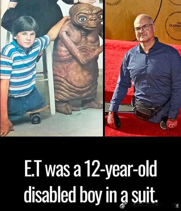 扮演外星人ET的演员。Matthew DeMeritt:一名天生没有双腿的12岁男孩,他用手走路,完美地模仿了E.T.独特的、笨拙的步态,尤其是在需要行走或跌倒的场景中,如电影中E.T.醉酒的场景。此外还有两位身材矮小的演员(身高均不足1米),负责E.T.站立不动或进行细微动作的其他场景。