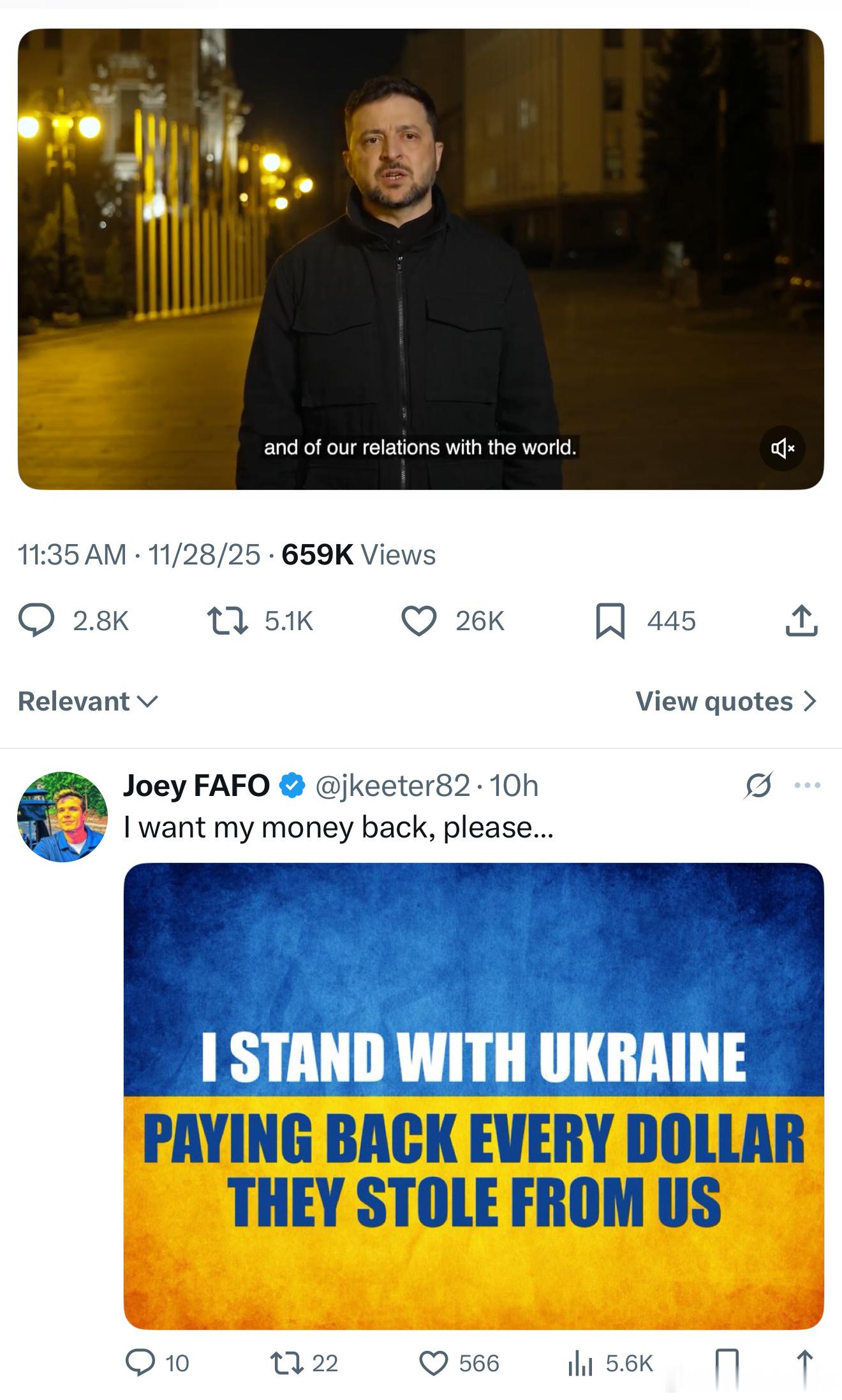 美国老乡在泽连斯基的X下面的发言:请把我的钱还给我。附图是一面乌克兰国旗,上面写的是:我支持乌克兰,把他们从我们这里偷去的每一块钱都还回来。