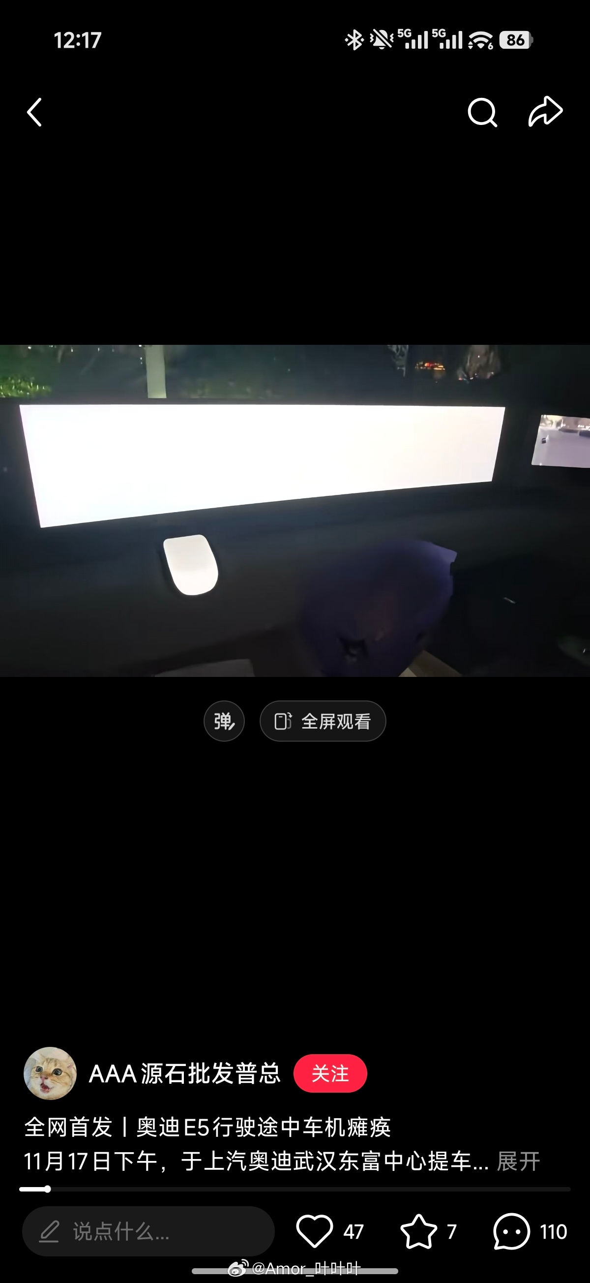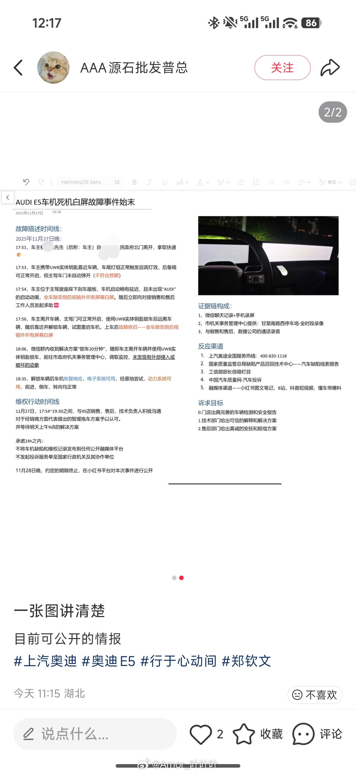 这哥们的上汽奥迪E5在启动过程中车机没有正常启动白屏了,发了个🍠维权,这时间线梳理的真详细啊……上汽奥迪也是傻,怎么连安抚过程也没有啊……