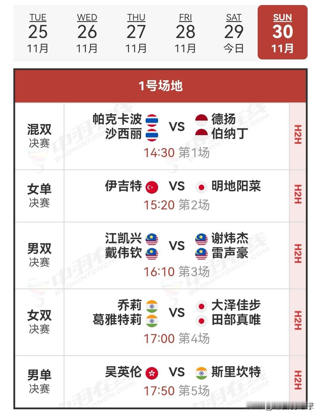 11月30日赛德莫迪羽毛球国际赛决赛安排 今日,半决赛已全部结束。吴英伦因对手古贺穗受伤退赛,顺利晋级决赛。 明日决赛将于北京时间14:30开启。届时,吴英伦将对阵东道主老将斯里坎特。男双方面,马来西亚选手成功会师决赛。详细对阵安排如下: 羽毛球赛事 羽毛球 羽毛球爱好者 羽毛球比赛 羽毛球赛程 羽毛球赛历