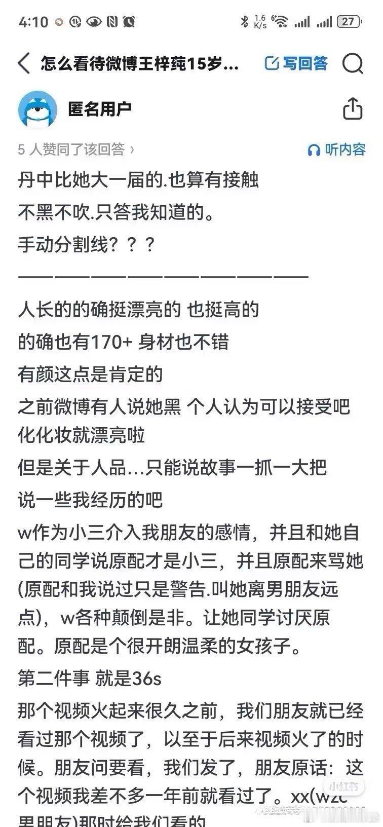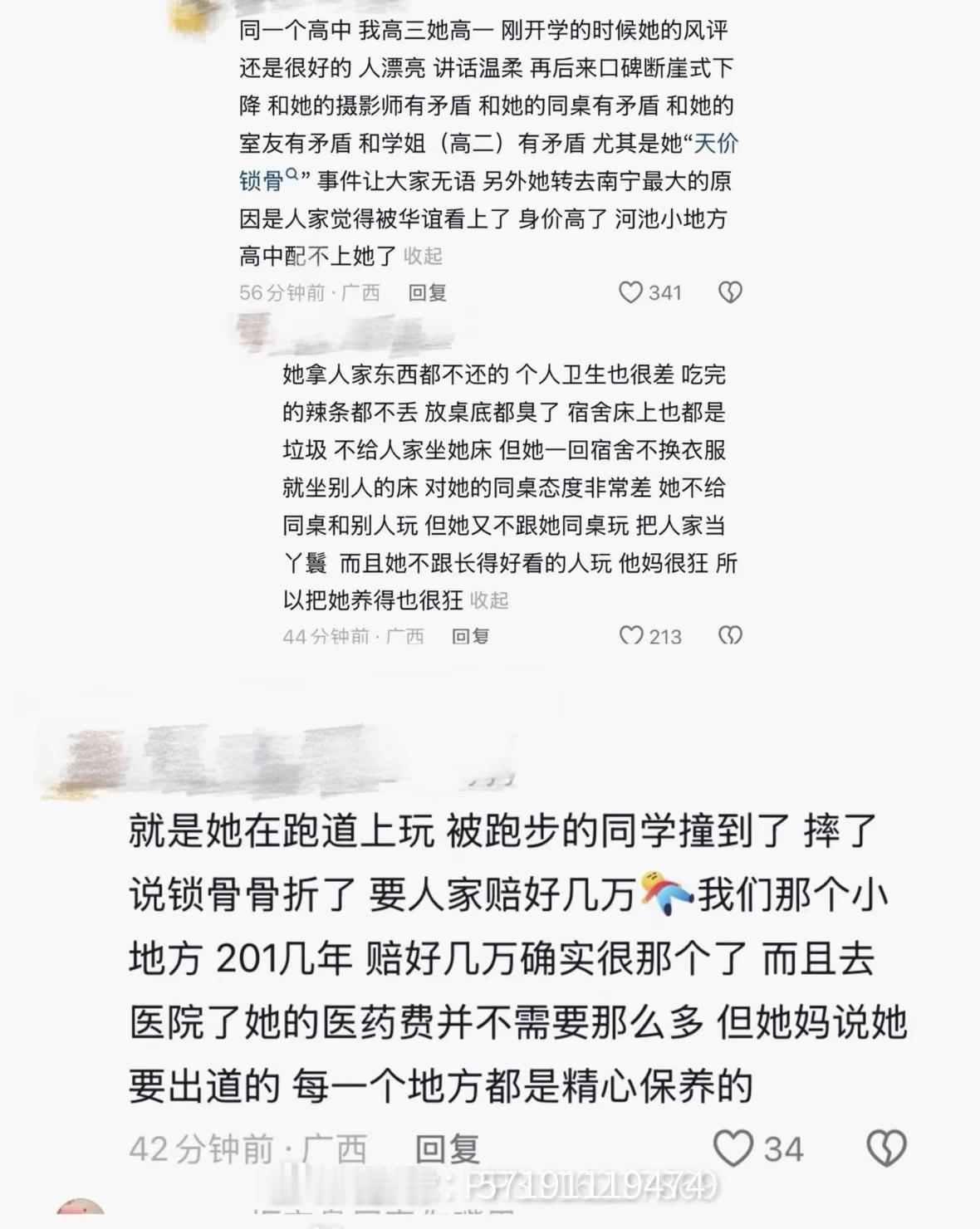 原来王梓莼被80是假的!知情人士戳破王梓莼谎言,不知道这次要花多少公关费? 疑似王梓莼同一个高中同学曝光,王梓莼高中时起初是风评很好的人,善良讲话温柔,后来口碑断崖式下跌,不管是摄影师,同桌,还是室友和学姐都和她有矛盾。 拿别人东西不还,个人卫生差,宿舍床上全是垃圾,不经过同意随便坐别人的床,孤立同桌,别同桌当丫鬟。 尤其是她还有天价锁骨事件,跑步时被同学撞到锁骨骨折,在医药费不高的情况下要求别人赔好几万。 如果她真的是这样的人,那么在我们的秘密2里,她对洁仪的的操作也就有解释了,咖啡不大脾气不小,超话才2000多个人粉丝才十几万,不知道需要什么公关? 没礼貌没家教,节目上说人绿茶,跟导演发脾气,节目上说人性缘脑,拿80卖惨,当初风评口碑差都是自己造的,包包这种老实孩子遇到王梓莼这种人也太倒霉了!