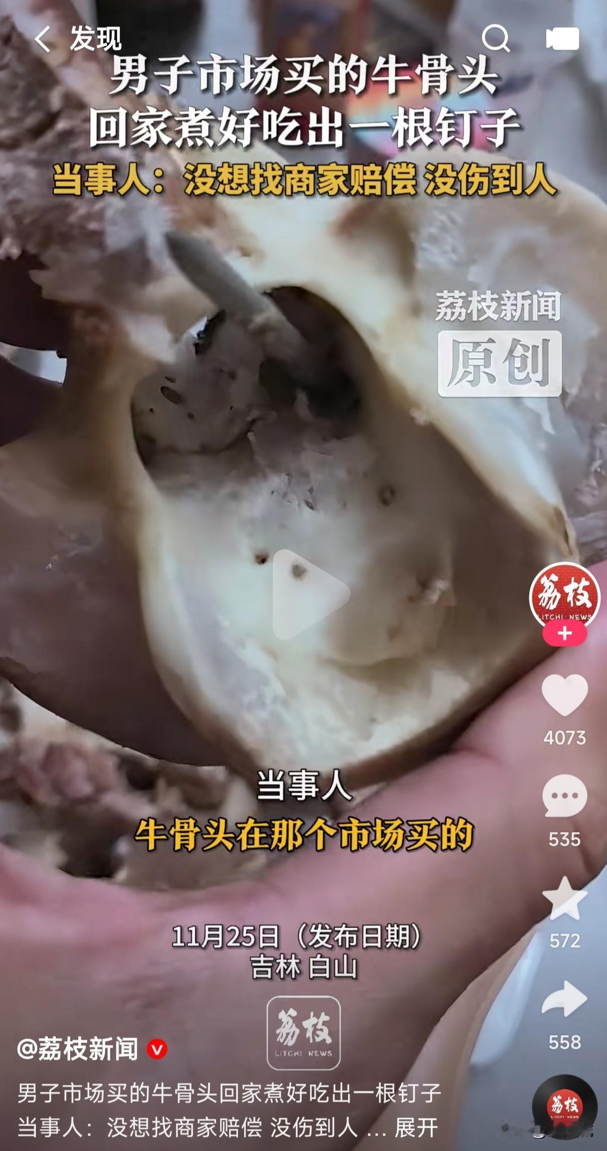 现如今市场卖的牛难道都不是宰杀的吗? 男子在市场买了一个牛头,拿回家煮好后吃的时候居然吃出来一根钉子。 他只是说牛头在市场买的,还好没有伤到人,也没有要找商家赔偿的意思,并且他说在牛头上钉着一个那么长的钉子,怀疑这牛不是宰杀的,而是被钉子钉在头上给疼死的,难道真的用钉子直接杀牛吗? 这钉子如果出现在牛的内脏里面还能说的过去,那可能是吃进去的,这脑袋上扎着那么长一根钉子难道真是被钉死的吗?