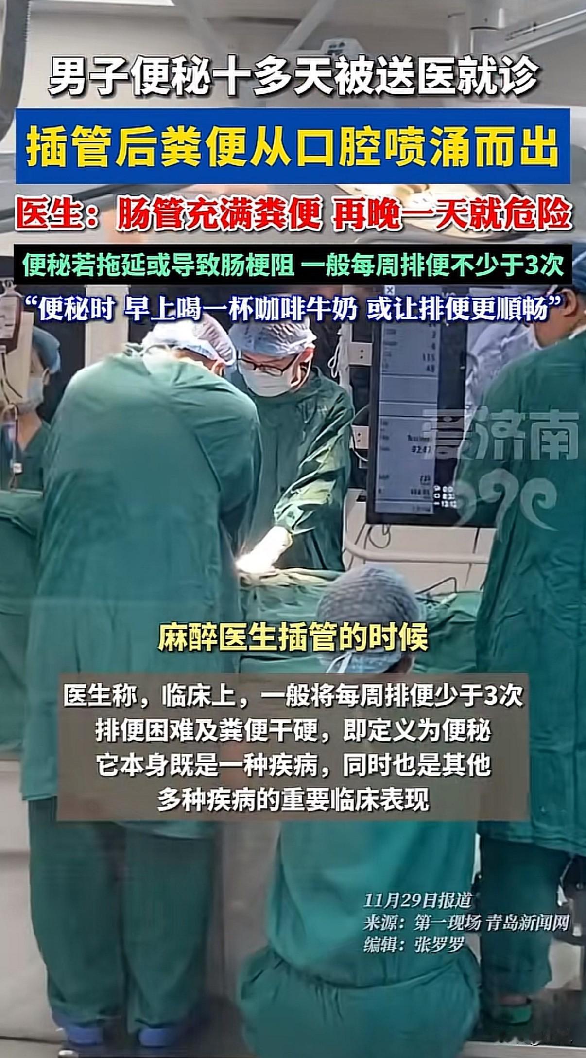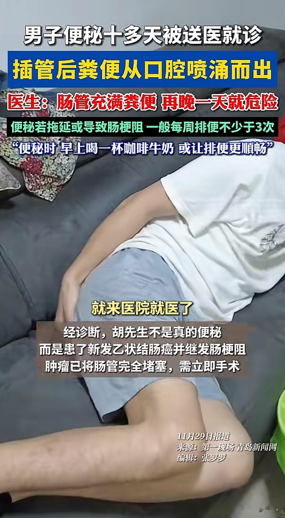 粪便从嘴里喷出来!深圳一位男子用亲身经历告诉我们,长期便秘真的不能硬扛。 胡先生便秘十多天,肚子胀得老高,家人赶紧送他去医院。这一查,查出了大问题。 医生诊断结果让人心惊:不是普通便秘,是乙状结肠癌继发肠梗阻。肿瘤把肠子完全堵死了,粪便下不去,只能往上涌。 广州中医药大学深圳医院肛肠科于林冲医生回忆手术场景时说:“麻醉插管时,粪便直接从患者口腔喷出。” 这个画面光想象就让人难受。当时胡先生的肠管里全是积存的粪便,肠道严重肿胀充血。这种情况特别危险,术后很容易出现感染休克。 胡先生手术后直接进了ICU,在重症监护室呆了二十多天才脱离危险。 这件事让我想起身边很多人对便秘的态度。总觉得是小事,喝点泻药就行了。 医生给出的便秘标准很明确:每周排便少于3次,排便困难,粪便干硬。 现在很多人都有自己的“通便秘诀”。我同事小张每天靠喝冰牛奶解决问题,隔壁工位的小李非加浓美式不可。 这些方法真的靠谱吗? 广州医科大学附属中医医院肛肠科主任陈诗伟说,长期靠刺激性食物促排便,会导致肠道功能紊乱,反而加重便秘。 肠梗阻的原因很多。可能是肿瘤,可能是炎症,也可能是肠道粘连。医生特别提醒,不要随便买泻药吃。暂时通畅了,可能掩盖了更严重的疾病。 如果出现腹胀、恶心、不排气不排便,肚子又胀又痛,体重还往下掉,一定要及时就医。 胡先生的遭遇是个极端案例,但也给我们提了个醒。那些流传的通便偏方,到底是在帮忙还是在帮倒忙? 每个人的身体状况不同,也许真的该找专业医生看看,别拿自己的身体做试验。