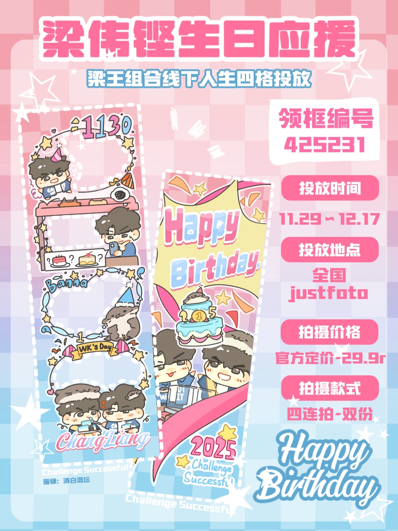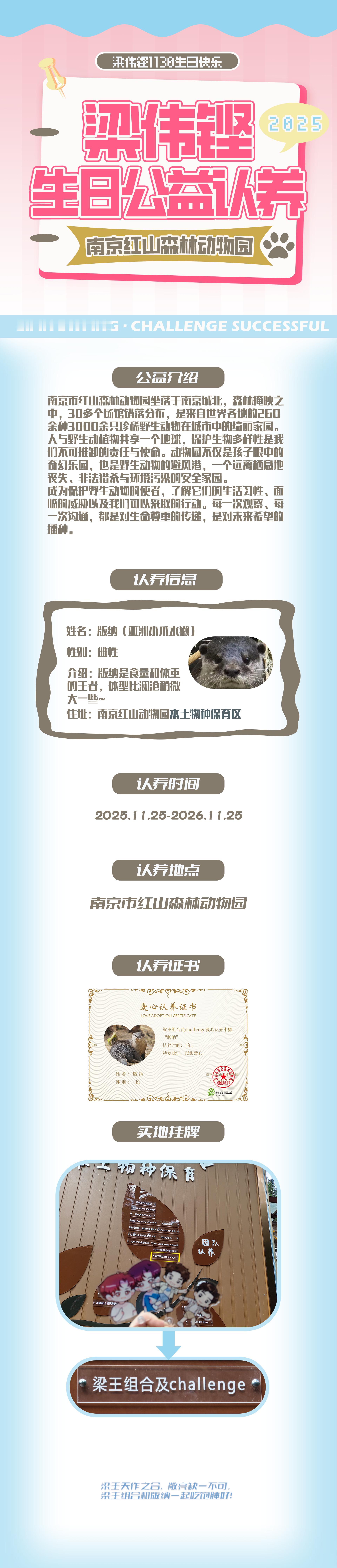 梁王组合 🐣梁王天作之合 🎂梁伟铿1130 生日快乐 🔥JUSTFOTO线下打卡企划·梁伟铿25岁生日公益认养🎂一年前,我们以「梁王组合及challenge」之名认养红山动物园水獭“版纳”;如今铿铿25岁生日将至,我们以续养延续爱心力量,陪伴梁王组合与版纳共同成长!📣现昶昶铿铿小版纳向你发出合照邀请:🗓️投放时间:11月29日-12月17日📍打卡地点:全国JUSTFOTO线下机器(编号425231)梁王天作之合,敞亮缺一不可!未来征途,我们继续并肩同行,共赴新程🌟认养公告美工: