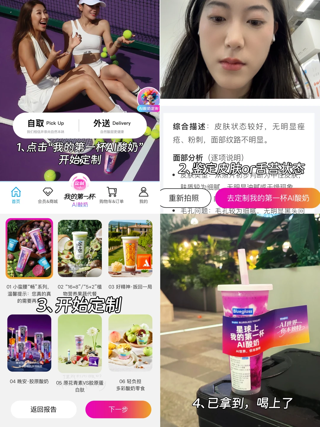 还能AI定制酸奶也是无敌,根据自身舌苔和皮肤状态可以定制,过程可以看图上流程~就在Blueglass的小程序里