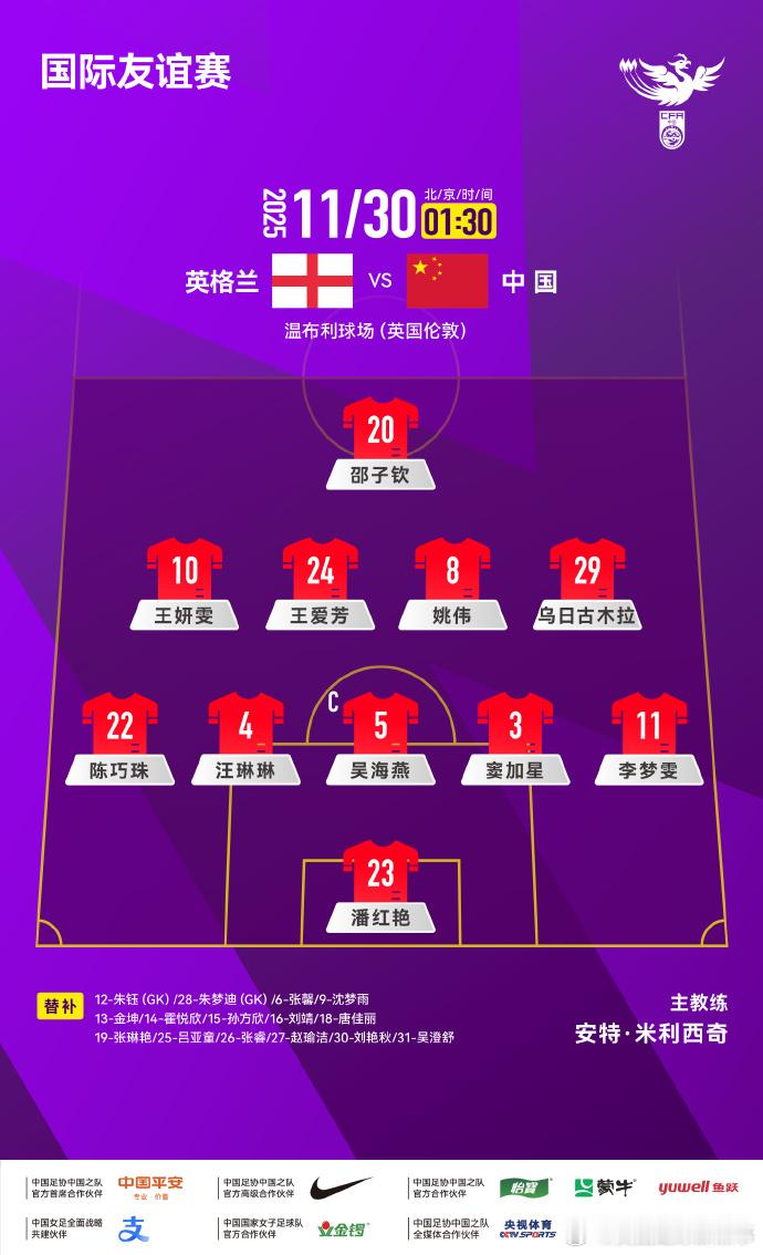 中国女足vs英格兰女足 双方首发,01:30开赛,还有30分钟
