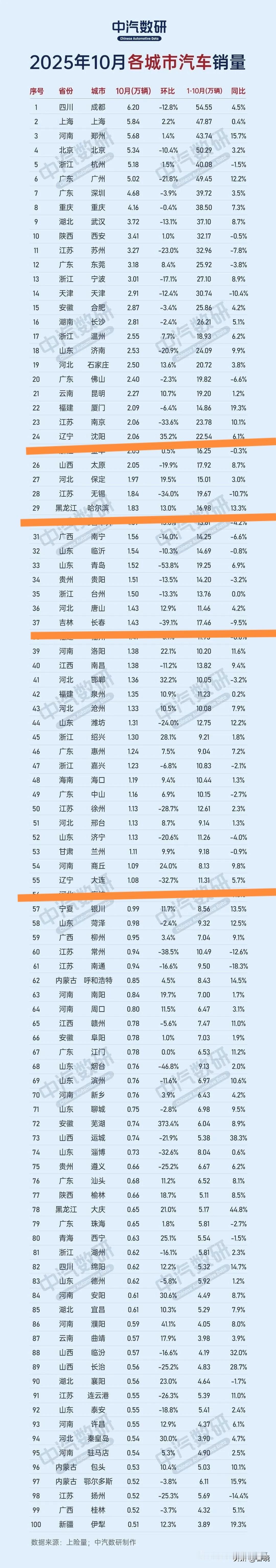 中汽数研公布2025年1~10月我国主要城市汽车销量数据 沈阳作为东北唯一汽车保有量超过300万辆的城市,销量仍然保持在东北首位: 沈 阳 10月销量2.06万辆; 1~10月累计22.54万辆。 长 春 10月销量1.43万辆; 1~10月累计17.46万辆。 哈尔滨 10月销量1.83万辆; 1~10月累计16.98万辆。 大 连 10月销量1.08万辆; 1~10月累计11.31万辆。 同时从增速看,沈阳、哈尔滨和大连均保持同比增长。 消费是经济最直接体现。