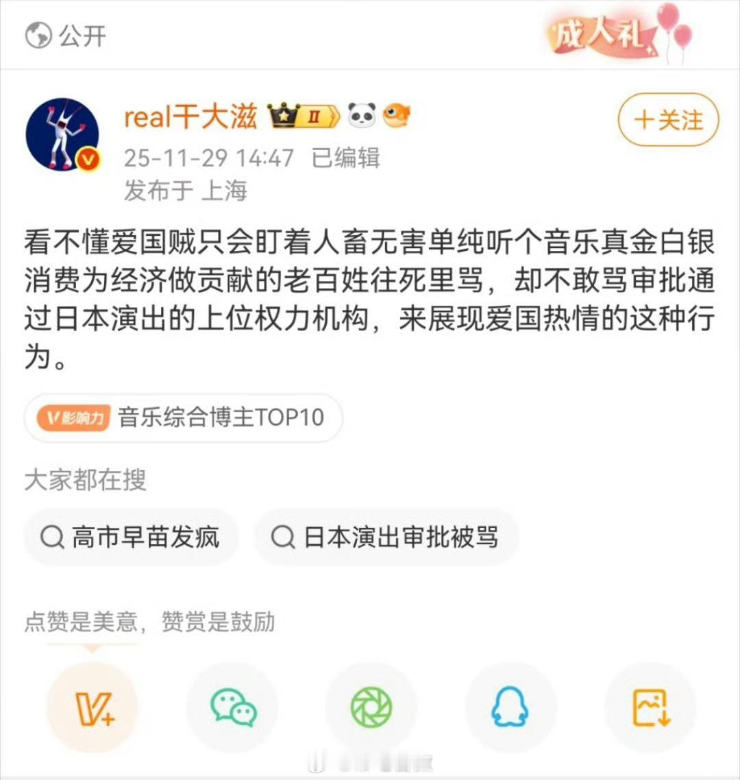 日本歌手在各地被禁演都没事,只有在上海会引起波澜,甚至还有人站出来表达不满,下面这两种言论是典型代表。⭐演唱会都是提前几个月审批的,审批的时候,谁知道高市早苗会发表错误言论?为什么不怪日本首相口出狂言公然干涉我国内政?如果日本政府不说那些话,或者早点把言论收回并道歉,会有这些事情发生嘛?⭐明知道官方已经出了禁演通知,某个地方的人不认真执行,阴奉阳违,或是临开始前叫停演出,或是直接中断演出,故意搞出舆论,到底想干什么呢?日本歌手上海演唱时被中断演出