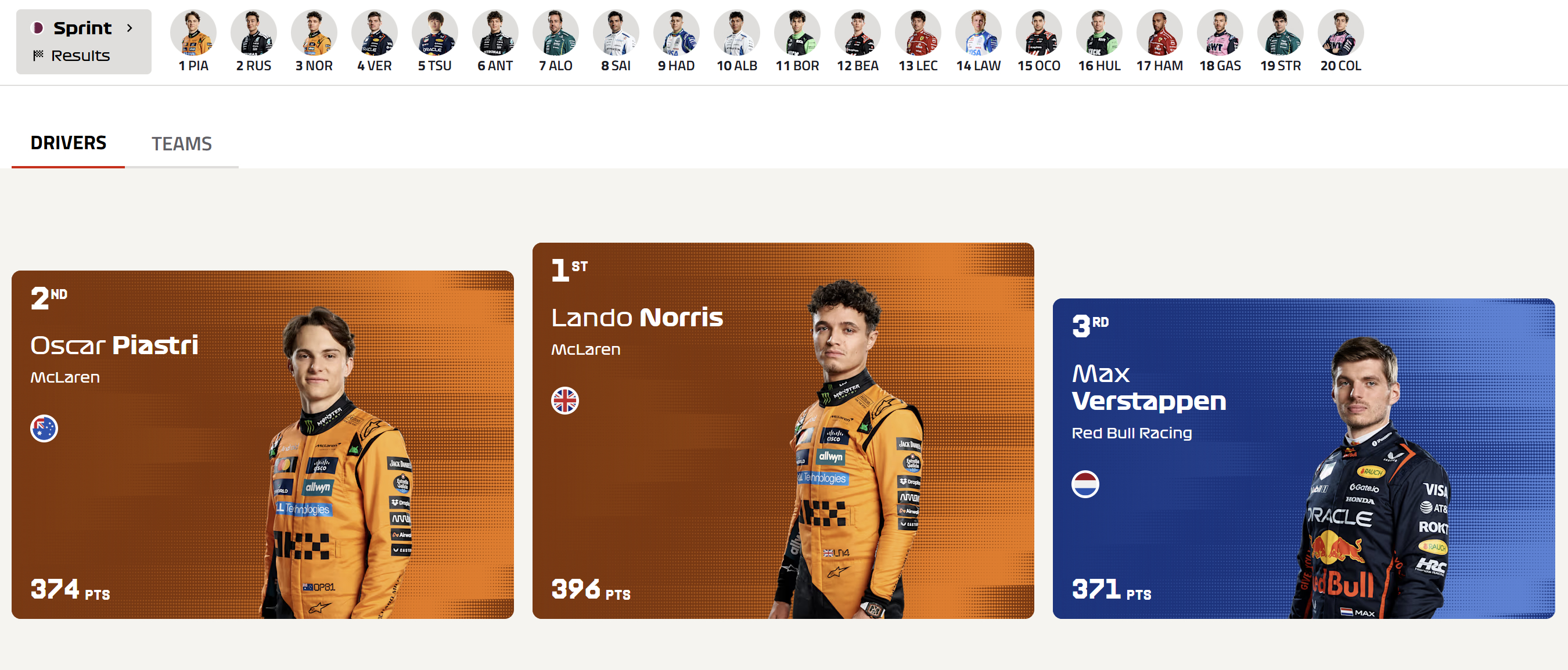 卡塔尔站冲刺赛结束后,诺里斯396分,皮亚斯特里374分,维斯塔潘371分F12