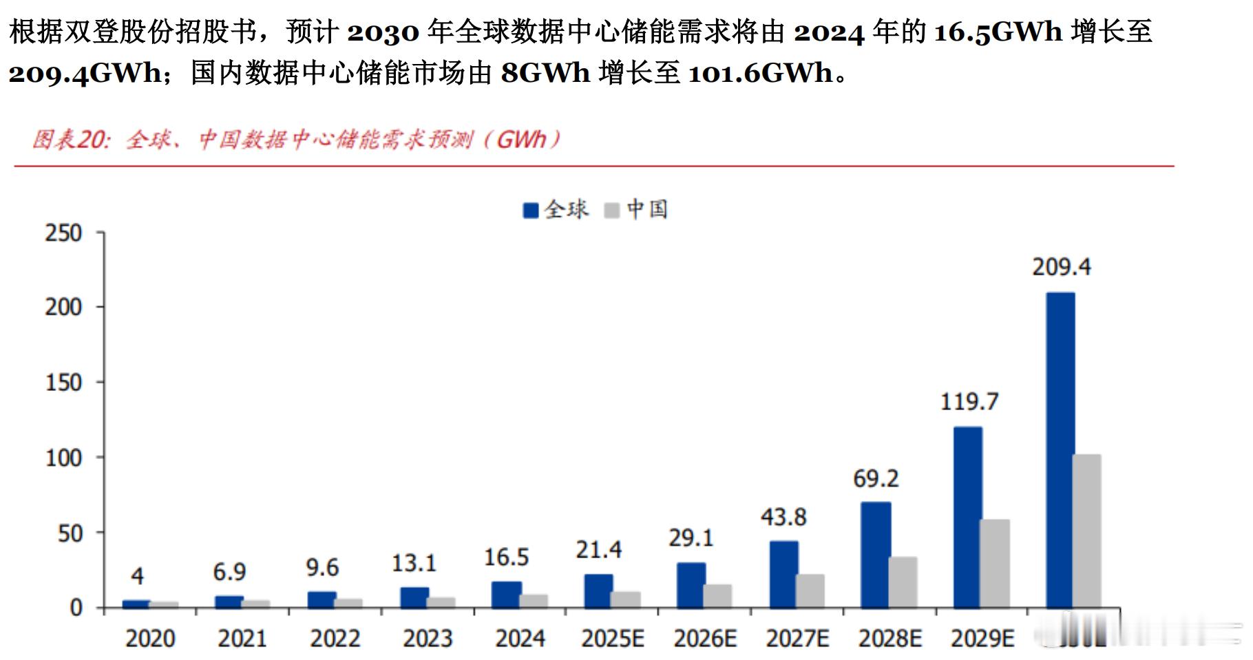 2030 年全球数据中心电力需求预计翻倍提升至 945TWh。根据双登股份招股书,预计 2030 年全球数据中心储能需求将由 2024 年的 16.5GWh 增长至209.4GWh;国内数据中心储能市场由 8GWh 增长至 101.6GWh。