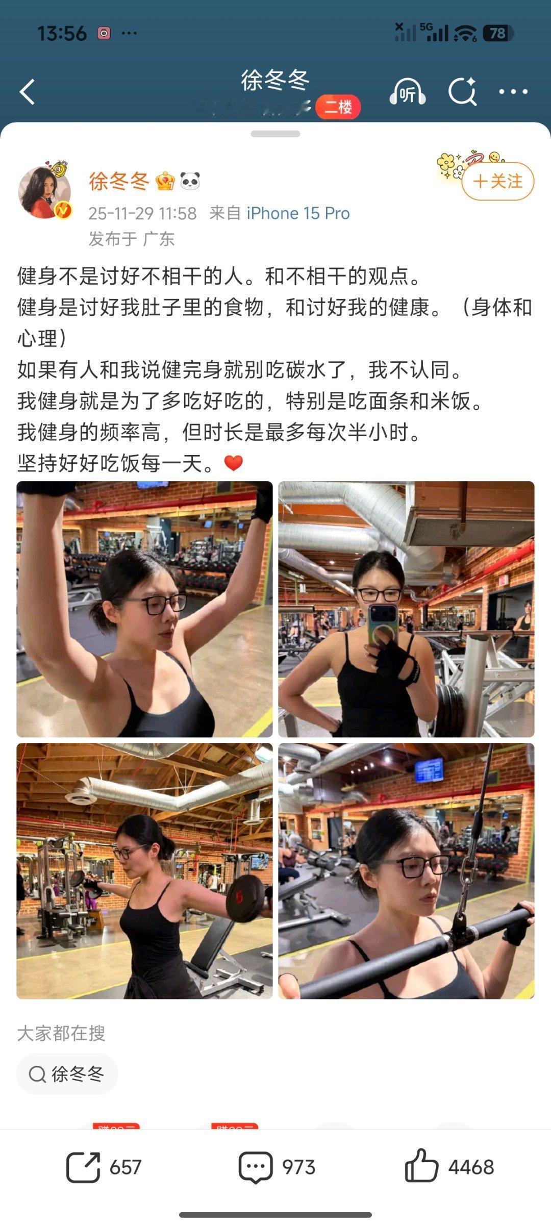 徐冬冬回应瘦了 太爱徐冬冬的清醒发言了!她回应瘦了时说,健身从不是讨好不相干的人,而是为了吃更多美食、守护身心健康。姐健身频率高但每次仅半小时,还坚持好好吃饭,真的太酷了!