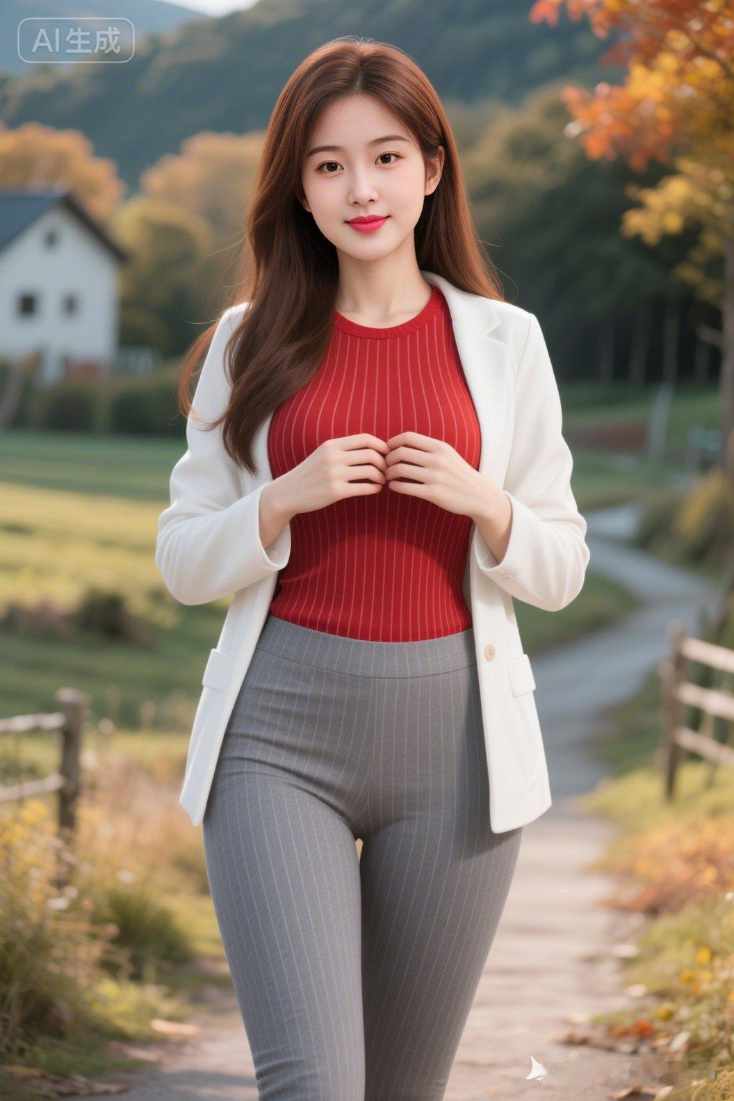 秋日穿搭指南:红白条纹上衣+灰色条纹裤,简约又时尚!
